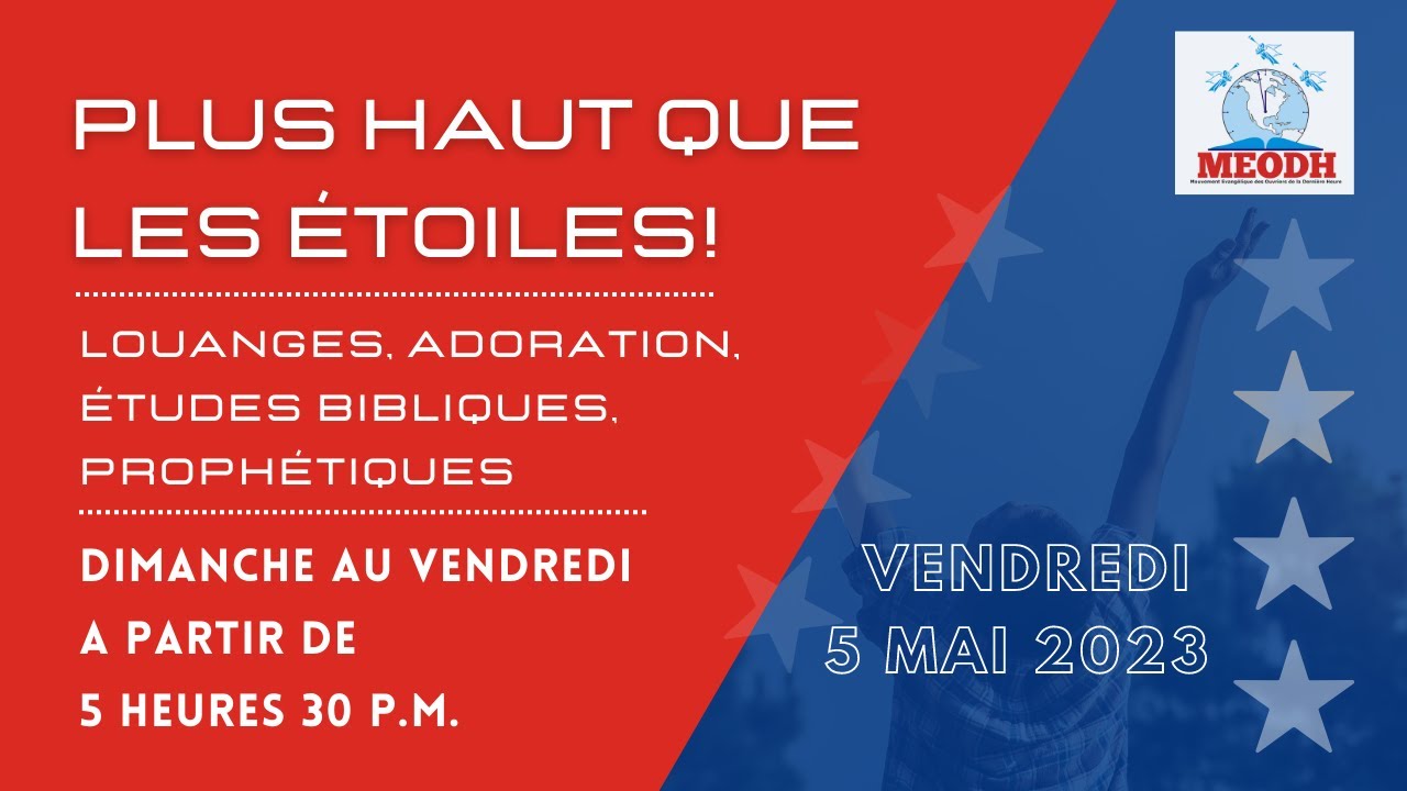 May 5, 2023 – Retransmission de Plus Haut que les Etoiles: Semaine de l’Esprit de Prophetie sur MEODH. Ce programme est retransmis non seulement sur Youtube mais aussi sur Facebook, Twitter, Roku TV, Podbean, la radio MEODH. Telechargez notre toute nouvelle application pour la radio sur Google Play Store.
