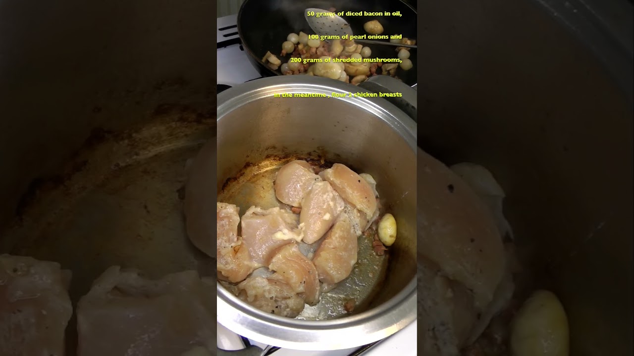 Coq au vin, my way, I use chicken breast, so it’s prepared quickly, fry 50 grams of diced bacon in oil,100 grams of pearl onions and 200 grams of shredded mushrooms, in the meantime , flour 2 chicken breasts and fry in a pan in oil, roast 2 tablespoons of tomato paste and deglaze with 2 cup of dry red wine. Simmer for 5 minutes on a low flame. Than add to the other ingredients. Add 300 ml chicken broth,season with pepper, 1 bay leaf,rosemary and thyme, simmer for 30 minutes on a low flame and done.Bon appetit!