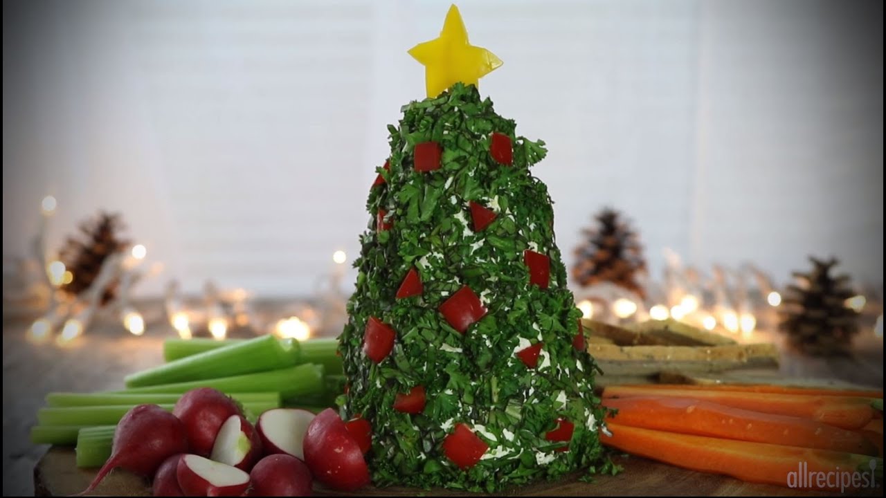 Watch how to create a festive, Christmas tree cheeseball using delicious ingredients and taking just a few minutes to prepare. A cheeseball base is made of whipped cream cheese, Havarti, Parmesan, garlic, lemon, and fresh basil. To give its tree-like appearance, we adorn the outside with chopped fresh herbs.