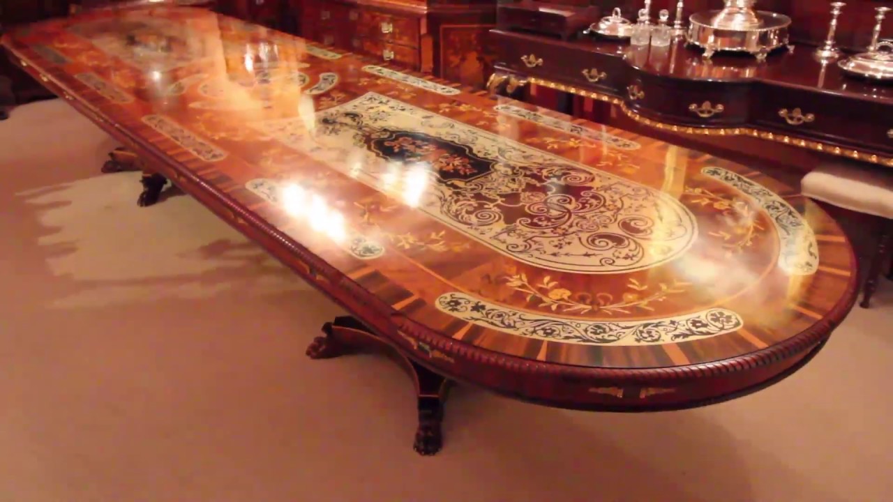 This wonderful large dining table is raised on two burr walnut ebonised and inlaid pedestals that are raised on hand carved solid mahogany lion’s paw feet.