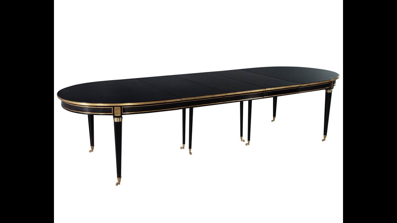 French 1940’s Maison Jansen Dining Table in Polished Black with Brass Detailing. France, circa 1940’s. Featuring high gloss polished black lacquered finish with all original brass ornaments. Table features 3 leaves with hideaway dropdown legs to support the extensions. Magnificent attention to detail with Louis XVI influenced style.