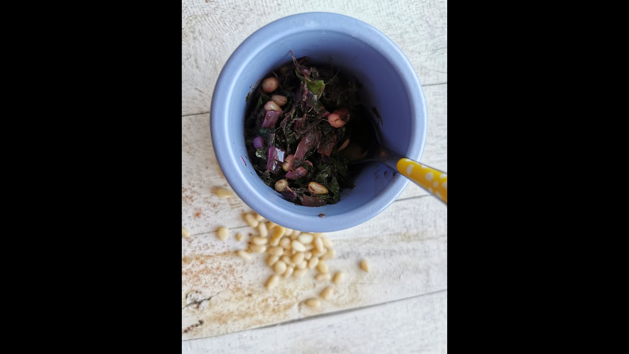 This beetroot greens pesto can be eaten on crackers or socca: or topped on cooked fish.