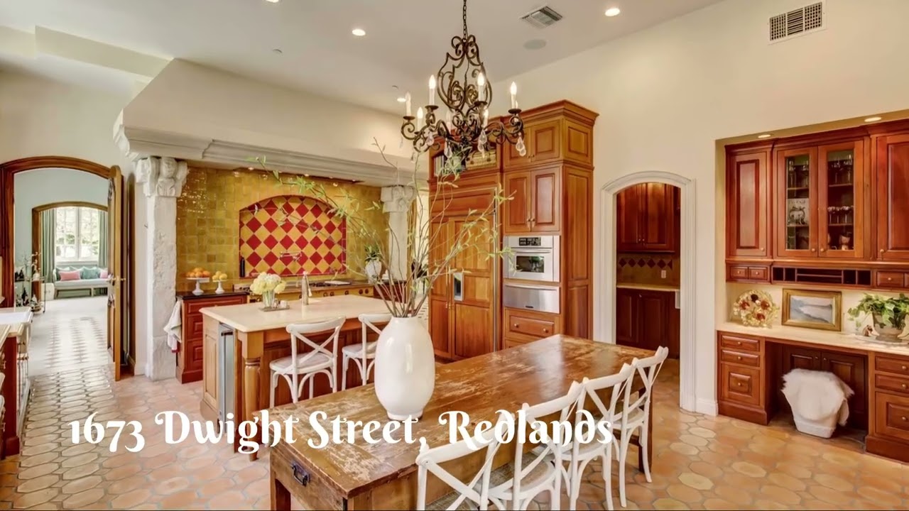 Take a trip to the French Countryside with this luxurious 5,507sf magnificent Provencal style manor sitting on over two acres of divine grounds, including an expansive citrus grove and picturesque terraces. Completed in 2006, built from hand-selected, hand-made and imported exquisite French materials and artifacts, the home was designed to replicate a 17th-18th century Bastide French Provencal home. Experience the beauty as you enter the private circular drive. Listen to the pleasant harmonies of the birds along with the calming sound of the entry fountain. Ascend the limestone stairs, cross the stone terrace, and approach the solid hand-crafted Walnut doors. The interior of the home is open and spacious with no hallways, but rather a dramatic center foyer and a 2nd-floor landing with wrought iron sconces. Look up and see the French Regency lantern chandelier. Custom crown moldings on the 12’ ceilings vary for each room. The fireplaces are elegant and finished with stone mantelpieces. The fireplace in the family room is made of Normandy bricks from a French farmhouse. The separate, intimate dining room has a barrel sky-blue ceiling and doors to the front terrace. The living room has a stone-trimmed arch entry and lots of light as do all rooms. Stunning custom cabinetry can be found in the private library with room for thousands of volumes. Continue to the Chef’s kitchen with honed stone counters, hand-formed ceramic tiles, a large preparation island with sink, and a La Cornue stove that creates an impressive focal point flanked by two antique stone column corbels. One lovely bedroom with an ensuite completes the downstairs. Upstairs are three bedrooms in total. Two are family bedrooms with ensuite baths and walk-in closets. The enormous master suite has an 18th-century fireplace, a generous dressing area, and a separate retreat. The master bath has an incredible solid rose marble bathtub with matching sinks. Exterior grounds include a gorgeous pool and spa, a Greek temple-style pool house with ¾ bath (great mother-in-law quarters or ADU opportunity), a limestone porch, a built-in BBQ area, and a shaded patio for entertaining. Oversized 3-car garage with direct home access. Golf cart distance to Redlands Country Club. Truly a spectacular and prestigious estate in a precious South Redlands location.