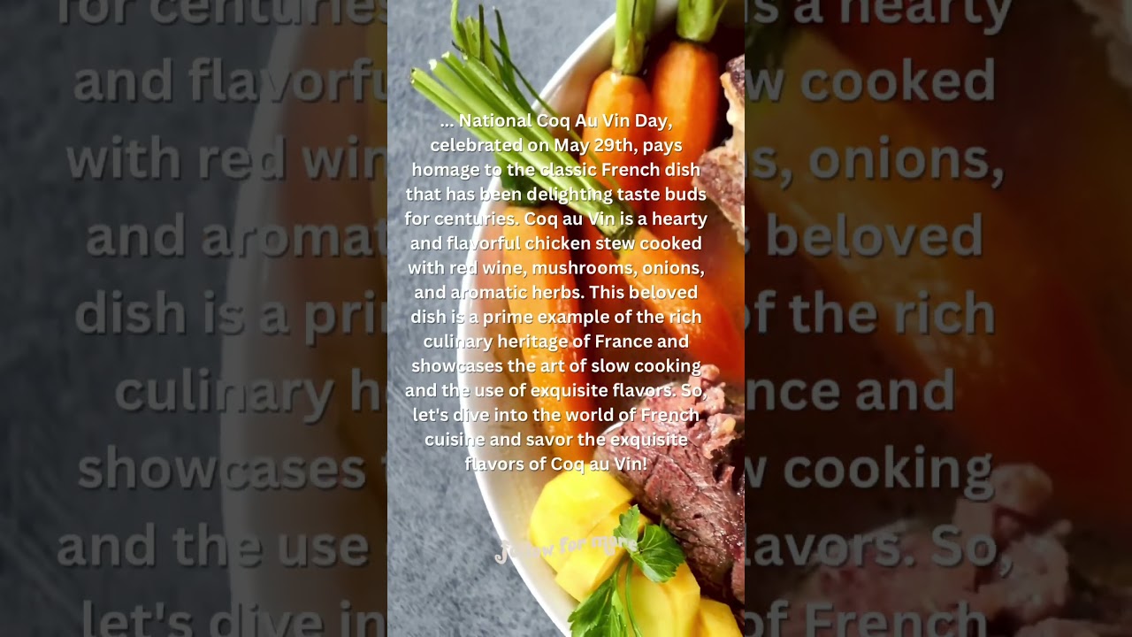 Bonjour, foodies! 🇫🇷🍷 It’s National Coq Au Vin Day, and we’re embarking on a culinary journey to France. Join us as we explore the rich flavors of this classic French dish, Coq au Vin. From the tender chicken simmered in a luscious red wine sauce to the earthy mushrooms and caramelized onions, every bite is a taste of culinary heaven. Whether you’re a seasoned chef or a cooking enthusiast, this dish is a must-try! 🍽️✨ Share your favorite Coq au Vin recipes, cooking tips, or even your first-time attempts at recreating this French masterpiece. Bon appétit! 🎥🔥 Don’t forget to use the hashtags and join the French culinary adventure! 📲💬 #NationalCoqAuVinDay #FrenchCuisine #ClassicRecipes #FoodieAdventures #ViralFoodJourney #NationalCoqAuVinDay #CoqAuVinCelebration #FrenchCuisineDelight #GourmetChickenDish #WineInfusedCooking #SavorTheFlavors #CookingWithPassion #FoodieDelights #DeliciousFrenchRecipes #CulinaryArtistry #TastyTraditions #GastronomicDelights #WineLoversUnite #BonAppetit #SavoryIndulgence #FineDiningExperience #FoodCultureCelebration #CuisineAppreciation #CookingInspiration #FlavorfulCreations #MouthwateringDishes #FoodieHeaven #FrenchCookingTraditions #TasteOfFrance #GourmetDelicacies #CookingWithLove #FoodEnthusiastsUnite #TantalizingTastes #FoodExploration #GourmetCookingAdventure #FrenchFlavorFiesta