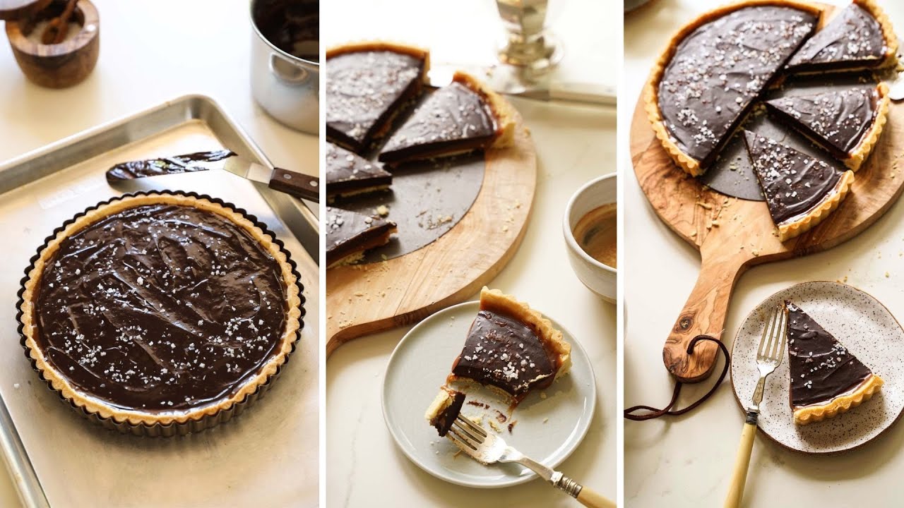This delicious salted chocolate caramel tart is an easy dessert recipe to make for your next dinner party! You’ll love the flakey buttery crust, the luscious caramel and of course the salted chocolate on top! And the best part is you can make the whole thing ahead of time, place it in the refrigerator and all you have to do is slice and serve!