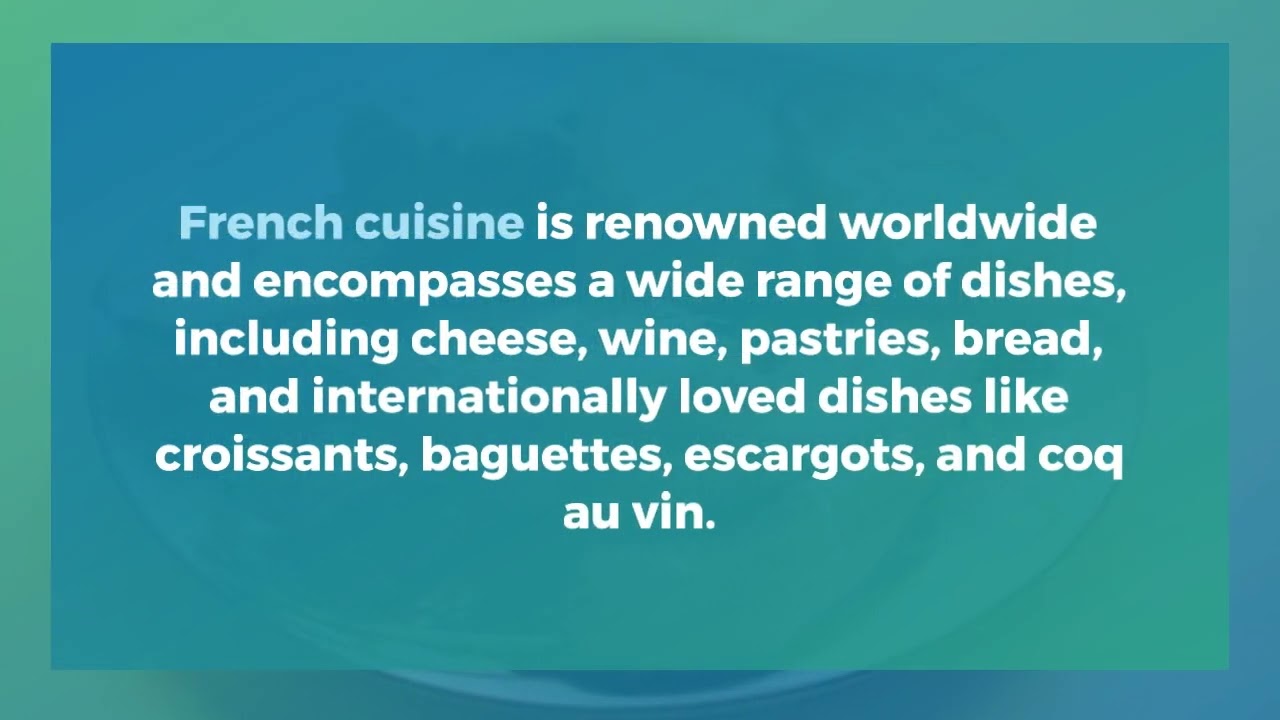 Cuisine: French cuisine is renowned worldwide and considered one of the finest in the world. It encompasses a wide range of dishes, including cheese, wine, pastries, bread, and internationally loved dishes like croissants, baguettes, escargots, and coq au vin.