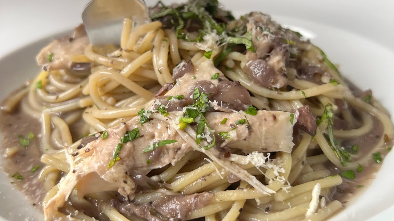 *Plate the pasta with some pulled chicken on top, followed by a ladle of sauce, fresh parsley, basil, cracked black pepper, and parmesan cheese.