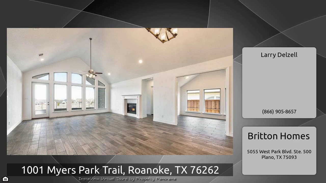 The Virtual Tour for the property at 1001 Myers Park Trail, Roanoke, TX 76262 listed for $599,900: Other homes for sale by Larry Delzell of Britton Homes: PERRY HOMES NEW CONSTRUCTION READY FOR MOVE-IN! Mahogany front door. Front porch. Library with French doors. Kitchen features an island with built-in seating space, a Butler's pantry and large pantry. Dining area flows into the open family room with a fireplace and a wall of windows. Game room with a storage closet. Master suite has three large windows. Double doors lead to master bath with separate vanities, garden tub and a large walk- …