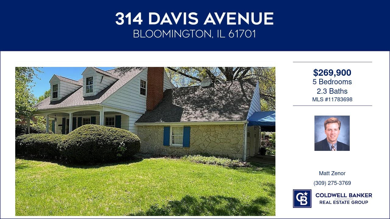 314 Davis Avenue Bloomington Illinois Homes for Sale | www.coldwellhomes.com | Matt Zenor with Coldwell Banker Real Estate Group | See full property details at | Great house in great location! Home w/ lots of charm & character near David Davis Mansion in highly sought-after Davis Addition neighborhood. Walk to schools & Constitution Trail. Corner lot. Sold as is due to estate sale. Hardwood & ceramic floors throughout. Huge private deck & patio great for entertaining or relaxing. Fence. Side load heated attached garage w/workbench & storage. Huge 29 x 8 covered front porch. Eat in kitchen & formal dining room w/ French doors to deck. Main floor bedroom w/ large private full bath including double sinks, walk in shower, ceramic floor, closet & more! Two brick FP’s. Large FR down with wet bar, half bath & FP is ready for all your entertaining needs. Bedroom 5 w/ private half bath. Two upper bedrooms with large window nooks great for storage, reading or a desk. Bedroom 2 includes a large desk, cath ceil, storage, bookshelves, etc. New kitchen counter tops.