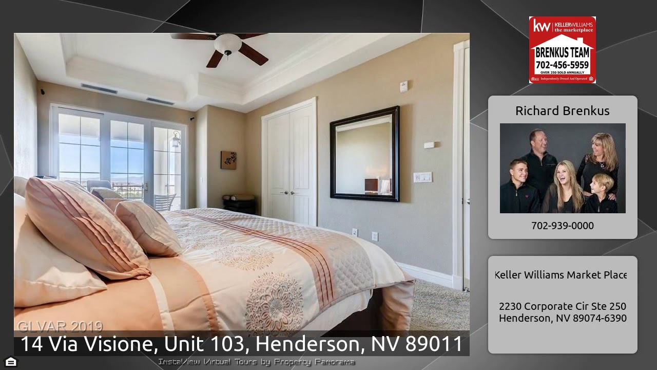 The Virtual Tour for the property at 14 Via Visione, Unit 103, Henderson, NV 89011 listed for $349,900: Other homes for sale by Richard Brenkus of Keller Williams Market Place: *Luxury Living In Lake Las Vegas W/ Access To 3 Pools, Cabanas, Clubhouse, Game Room & More*Golf Course Frontage*Views Of Lake, Vineyard & Golf Course From Back Patio & Balcony Off Mstr Suite*18" Travertine Floors*Crown Molding*Clng Fans*Fireplace In Living Room*Lrg Island In Ktchn W/ Granit Cntrs, Island, Backsplash, Stainless Steel Appliances & Wine Fridge*Lrg Bedrooms W/ French Doors To Mstr W/ Jetted Tub & Double …
