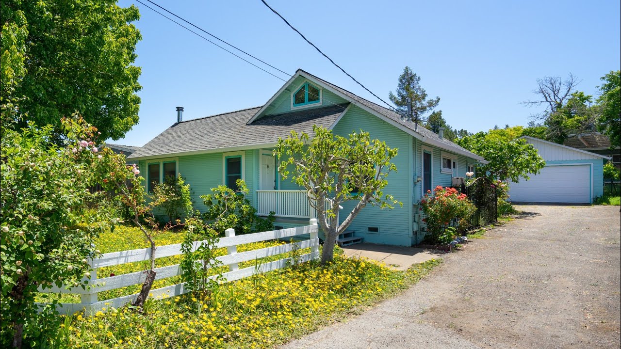The sought-after opportunity for a wonderful Grant Avenue home is here, and next door to the illustrious Grant Elementary School no less! The delightful front yard offers plenty of space for a green thumb with lovely trees bordered by a white picket fence. A covered porch entry leads into the home bursting with Petaluma charm. Hardwood flooring leads to the living room with glass French doors, a wood burning stove, vaulted ceiling, and backyard access. Continue on to the kitchen with large pantry, O’Keefe and Merritt range, display cabinetry, and bartop overlooking the bright dining nook surrounded in windows and a back door. The living spaces include two bedrooms, one with a tile floor and backyard access, and a full bath. A unique ladder staircase leads up to a loft with natural light and ample attic storage, perfect for a home office or work-out area. Venturing out to the backyard reveals a lush, private space with lawn, mature trees, patio, and deck. Near the back of the lot you’ll discover an enclosed workshop and the ginormous detached 2-car garage at the end of the gated driveway. It’s a sweet Petaluma package smack dab in one of the premier westside neighborhoods!