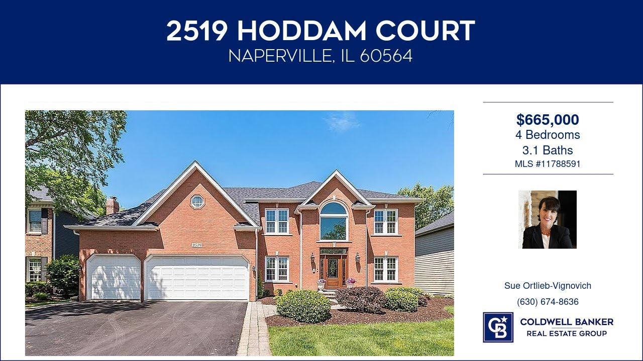 2519 Hoddam Court Naperville Illinois Homes for Sale | www.coldwellhomes.com | Sue Ortlieb-Vignovich with Coldwell Banker Real Estate Group | See full property details at | *Multiple offers have been received. Highest and Best due on 6/3 by 8:00 p.m.*Nestled in the desirable Harmony Grove subdivision on a tree lined cul-de-sac, we offer this impressive home. Upon entering the grand foyer that is bathed in natural light you immediately feel pride of original ownership. The home offers four large bedrooms, a main level office with double French doors which can also be used as a guest room and three full baths and one half bath. The master suite has an exquisitely designed bath with large walk-in shower and a sky light over the stand-alone soaking tub. Double vanity with custom cabinet and LED mirrors. Gourmet kitchen with granite and stainless-steel appliances and spacious island with separate eating area. Gather in the family room for starry night viewing through skylights or cozy up to the fireplace. Double stairways for added convenience that lead to 2nd level from foyer or family room. Formal dining and living room perfect for entertaining. Small loft area ideal for utilizing as reading nook or small sitting area. Laundry room is equipped with a utility tub and a separate large walk-in storage area. There is a laundry chute from 2nd level of home that goes directly into first floor laundry room. The backyard is meant to be enjoyed with a brick paver patio surrounded by privacy shrubs. A finished basement with full bath and bar area allows for more living space and entertaining. Original owners to this home have maintained extraordinarily. New roof and siding with 50-year warranty in 2020. Furnace and A/C replaced in 2014. Triple pane windows throughout with lifetime warranty in 2017. A commercial grade self-draining with release valve irrigation system 2000. Highly acclaimed school district 204. Walking distance to elementary school, park and ponds.