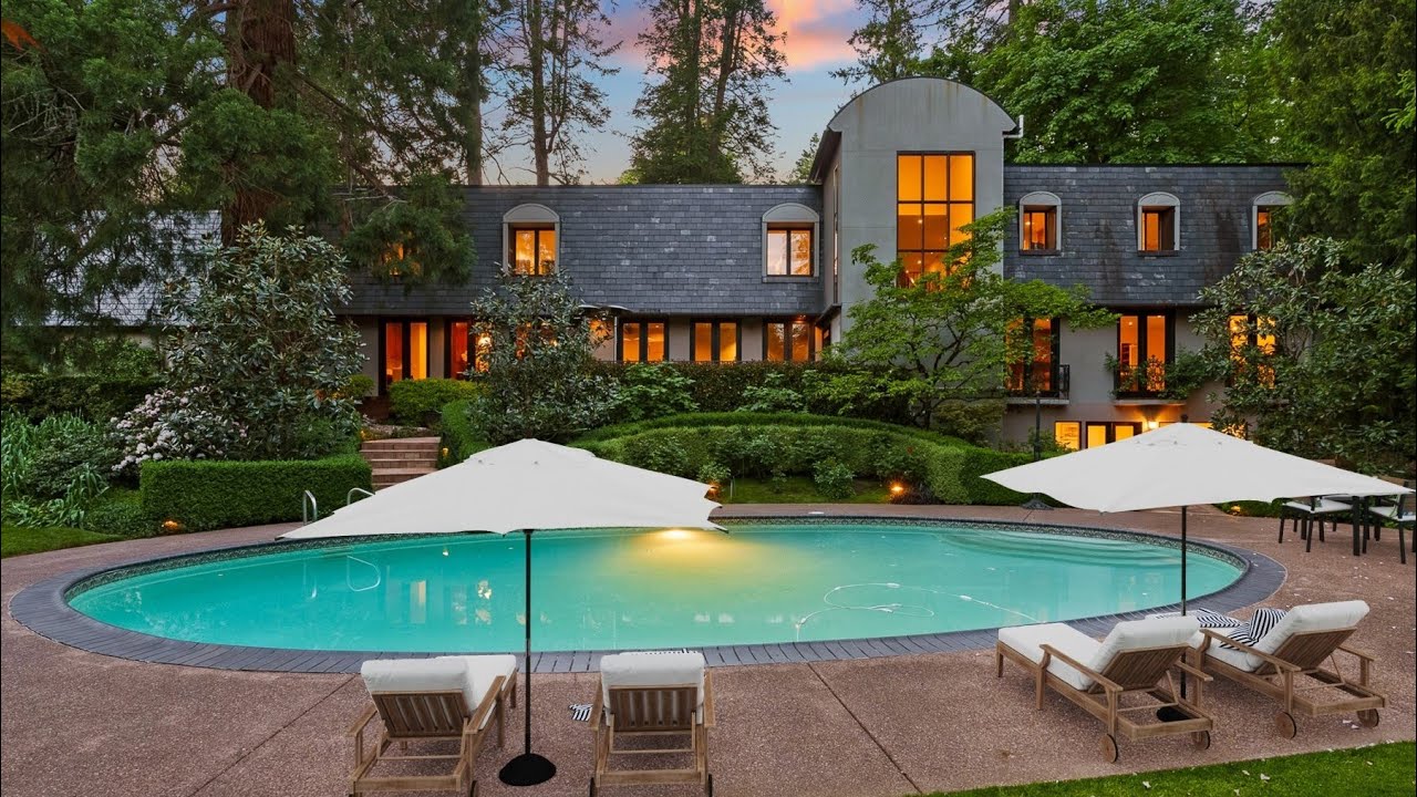 European glamour lights up every room in this luxurious Dunthorpe Riverdale estate nestled back at the end of Greenwood with a lovely pool, lush grounds, and private cabana/guest suite. Revel in the stunning 19′ ceilings with mezzanine landing, parquet and heated floors, ‘ballroom’ living room with grand hearth, elegant library and dining room, and family room connected to an amazing gourmet marble kitchen with adjacent 2nd full caterer’s kitchen plus temp-controlled collector’s wine cellar! Truly an estate for the ages, this singular offering has been extensively remodeled and features 15 sets of French doors opening to the water feature, pool, and entertaining decks. Imported Italian fireplaces, a tech room, a classic wet bar, whole-home sound system, and exceptional millwork bring together the best of a classic appreciation for quality with modern living amenities. Stroll down to the twilight pool for a magical evening surrounded by beautifully tended private gardens. Enjoy the serenity privately or play host to destination dinner parties flowing from inside to outdoors with ample space to kick of your shoes and dance. Custom designed with a private primary wing with adjoining fitness room and nearby executive office, plush bedrooms suites, laundry on both levels, an elevator-ready shaft, 5 fireplaces, and prolific built-in closets and storage, you’ll find no desire unmet. 2 total parcels totaling .81 acres ensure privacy and plenty of room to create a sanctuary all your own. Accesses Portland’s top-rated Riverdale School district and centrally located between vibrant Lake Oswego, nearby Lewis & Clark College, OHSU, and key Portland conveniences.