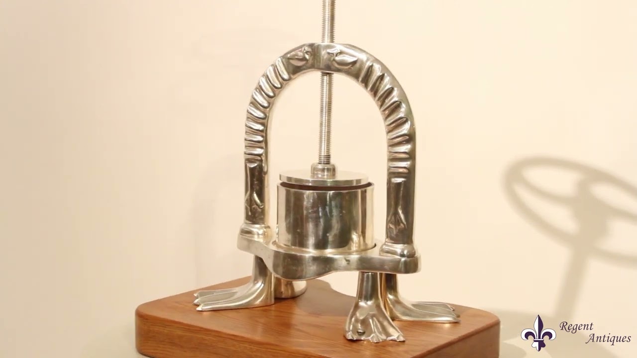 The duck press has decorative embossed decoration, with ducks, etc, and stands on four substantial legs fashioned as webbed duck feet. It is mounted on a shaped solid oak base and is fitted with a removable pot with strainer and fitted with a spout. The press is a flat disk driven by a turn screw via a wheel at the top.