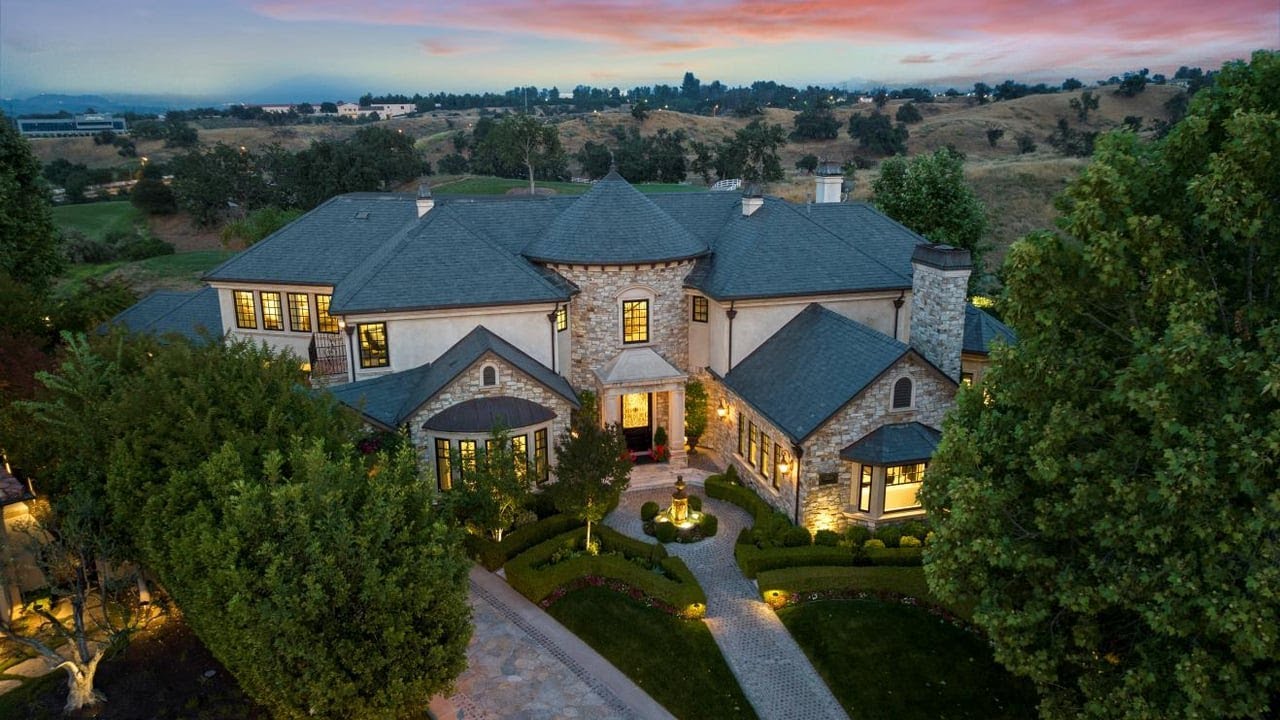 See the Property Website! :: Kathy Bost – RE/MAX of Valencia – 661-803-3114 :: Nestled behind the guarded gates of Valencia’s Westridge Estates, this custom and completely renovated home is a symphony of thoughtful design and high-end finishes. The grandeur begins with an arched Porte cochere and a stone driveway, leading to a 4.5-car garage. Sweeping views from the two balconies overlook the 17th hole of The Oaks Club. The wainscoted foyer boasts a two-story, multifaceted custom ceiling with an elegant chandelier and a curved wrought iron staircase to the upper level. The recently renovated kitchen is an entertainer’s dream with a large quartz island with seating, double Sub Zeros, a Wolf cooktop, Wolf double ovens, a Wolf microwave, a warming drawer, and a steam oven. There is ample storage in the butler’s pantry, which includes a beverage cooler and ice maker. The main level features a study with a bay window, custom built-ins, an in-law suite with private bath and laundry room, and a beverage cooler with French door sliders to the backyard. There is a second ensuite bed and bath with French door sliders to the backyard. Spacious formal living and dining rooms with upscale designer chandeliers. Upstairs, the primary owner’s suite wing has its own office, custom built-ins, beverage cooler, fireplace, and a walk-in closet fully customized. Several large and inviting balcony areas off the primary suite and bedrooms. The well-manicured landscape features European gardens, fountains, and a recently refinished pebble-tech saltwater pool and water feature. Entertainer’s yard with covered patio, fireplace, TV, and custom BBQ with seating. French Normandy-inspired, with adorned stone and custom hickory wood floors, this home melds grace and modern luxury. All new windows, doors, Control4 with security, and new HVAC systems help this home run efficiently and securely. Adjacent to the Oaks golf course and top-rated schools, with no Mello Roo’s taxes, this estate is peerless in elegance and location. Every room has been renovated with a feel that you will want to bask in. Very private lot on a cul-de-sac with no rear neighbors. There is just too much to list, this is a stunning residence!