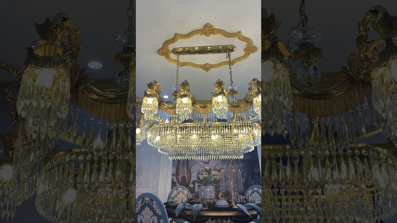 This elegant chandelier features a sturdy brass frame that adds a touch of sophistication to any dining room. Adorned with sparkling crystal, it exudes a dazzling brilliance when illuminated. a length of 65 inches, it hangs from the ceiling, creating a focal point that the ambiance dining area. This chandelier is the perfect choice for those seeking a combination of timeless beauty and functional lighting.