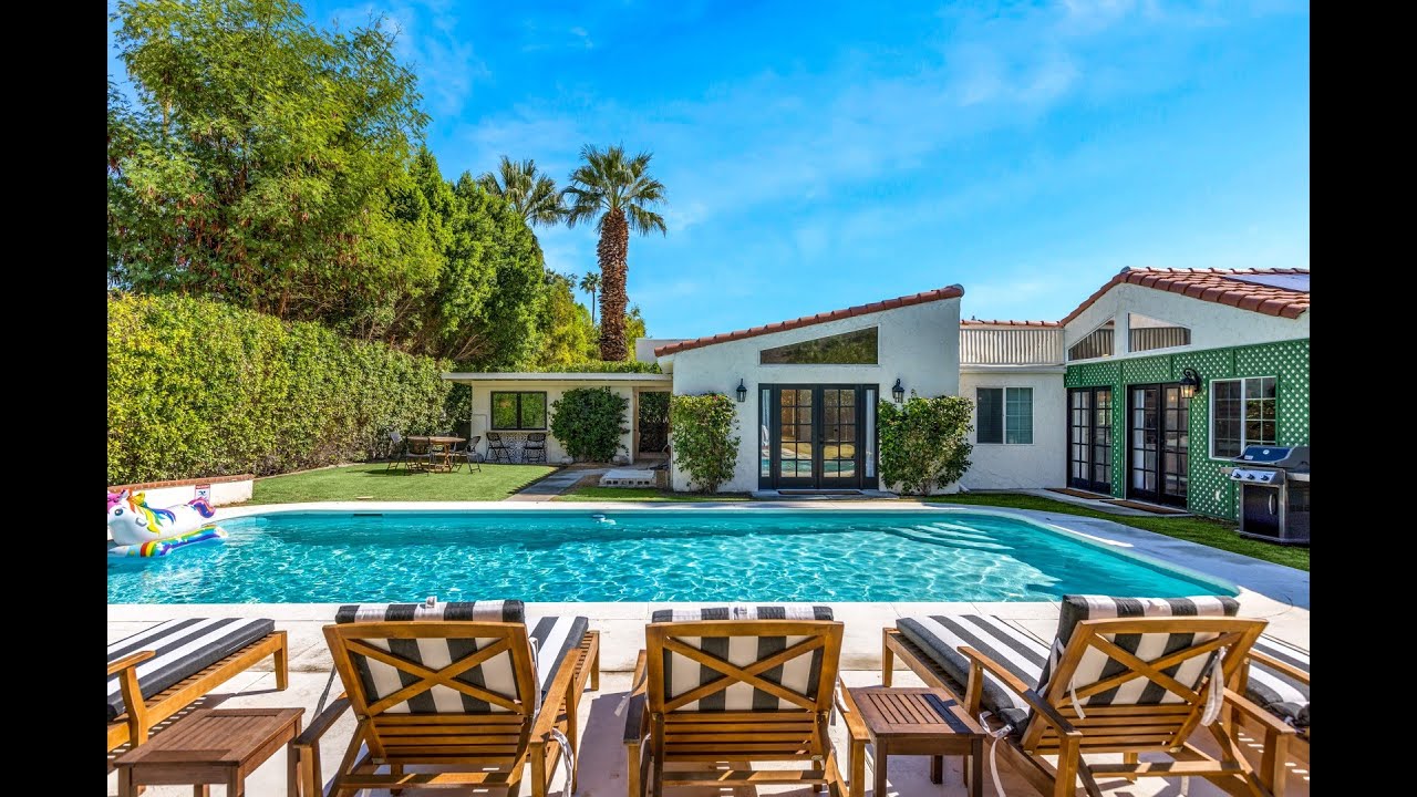 “Villa Colusa” epitomizes the allure of residing within the prestigious Movie Colony of Palm Springs, a mere block from the bustling downtown. Ensconced behind dual entry gates, this meticulously reimagined single-level estate affords exceptional walkability to a myriad of premier restaurants and high-end boutiques in the vicinity. The four-bedroom, three-and-a-half-bathroom residence radiates sophistication, boasting an authentic stone fireplace, beamed ceilings, elegant barn doors, custom window treatments, sumptuous finishes, designer light fixtures, and exquisite French doors leading to the backyard. Designed for seamless entertaining, the expansive great room flows into a gourmet kitchen replete with bespoke cabinetry, a Thermador 8-burner range, Sub-Zero refrigerator, dual dishwashers, and a striking waterfall island illuminated by pendant lighting. Two opulent master bedroom suites and an additional bedroom feature en suite baths, while the fourth bedroom currently serves as a versatile office space. Venturing outside, the private, resort-like grounds offer unparalleled, unobstructed vistas of the majestic San Jacinto mountains from the serene pool area. Further distinguishing features encompass a capacious driveway with ample guest parking, a two-car garage embellished with epoxy flooring, a comprehensive solar panel system, and an existing vacation rental license; new proprietors may reapply for licensure post-acquisition. Evocative of an exclusive resort haven, Villa Colusas tranquil, secluded ambiance beckons as your unparalleled desert abode.