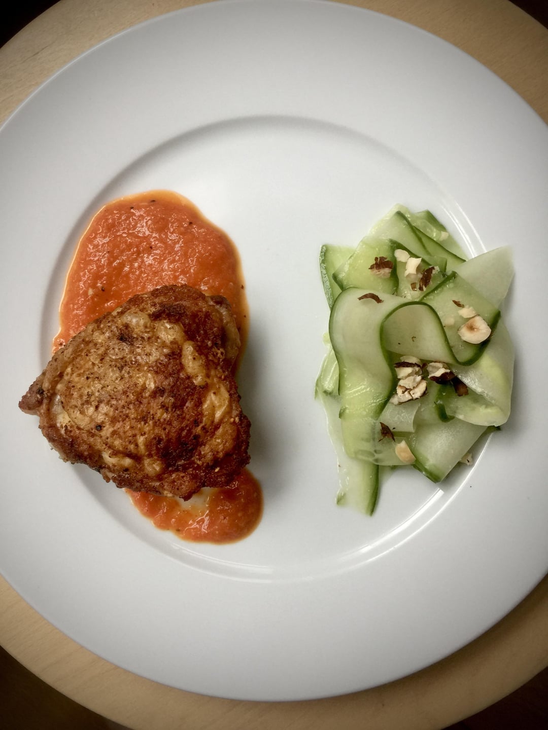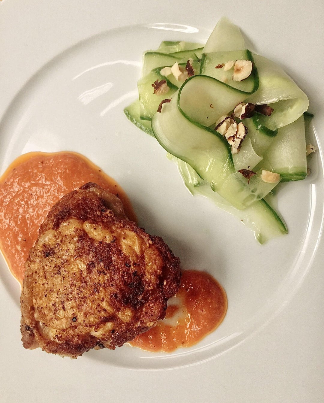 Haut de cuisse croustillant, romesco, salade de concombres marinés et noisettes torréfiés