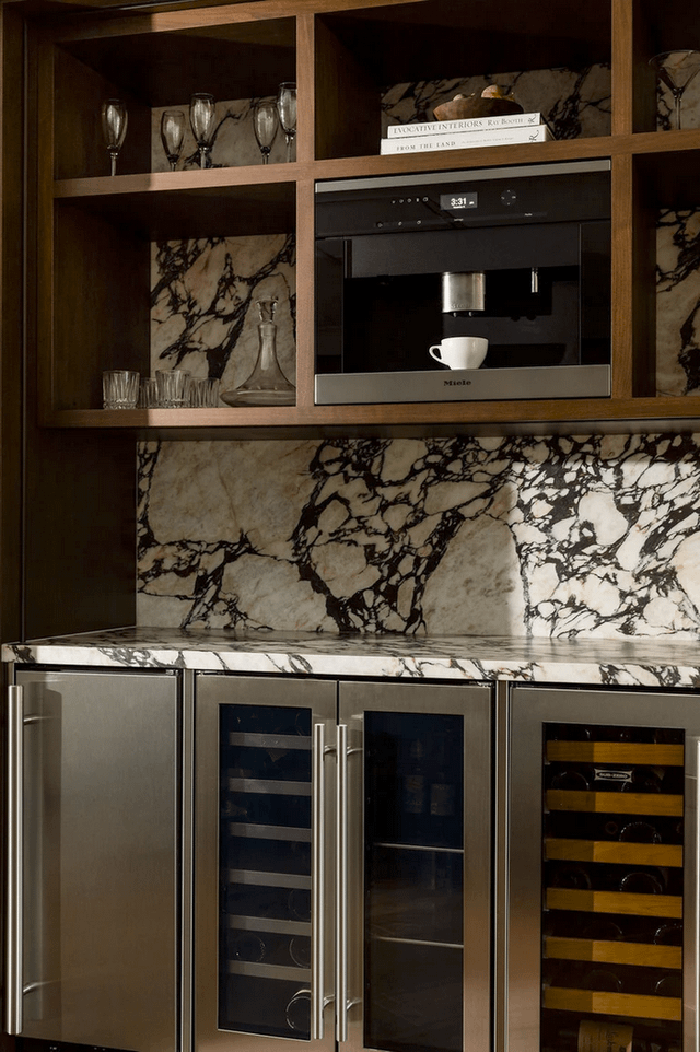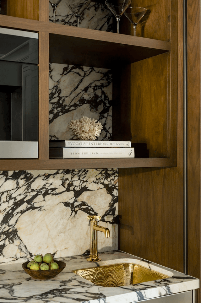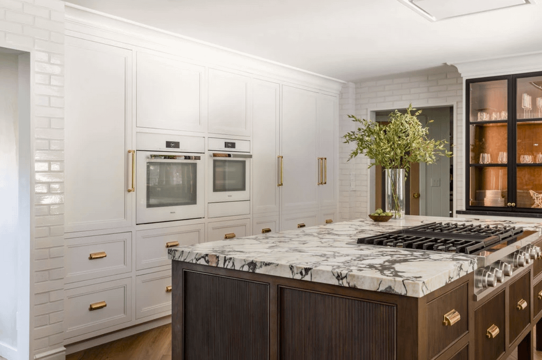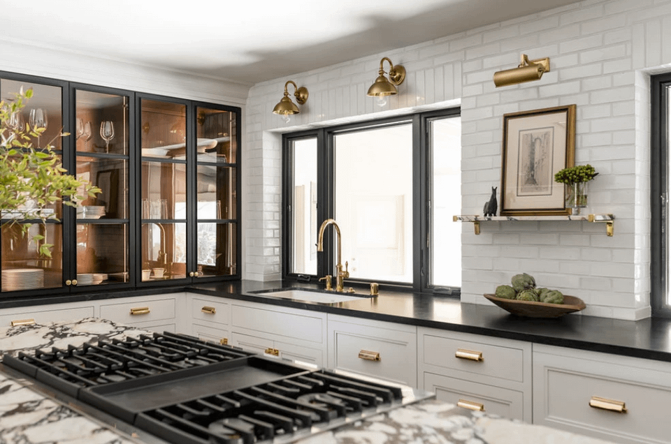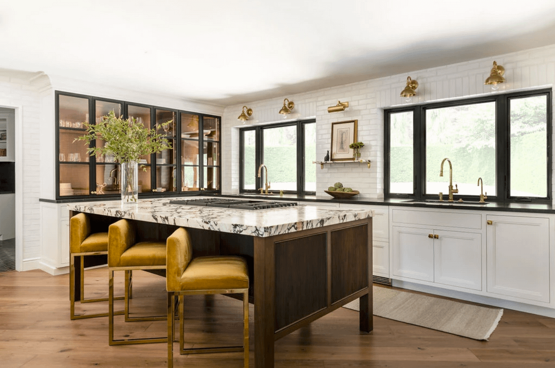 The black frames against the white tile looks so awkward. The crown moulding is like a glue on “because it’s fancy” addition that doesn’t belong there. The light fixtures are inappropriate for the space. The richness of texture and color from the counters and wood accents, would be nice if they were balanced with a hint of color. The white cabinets look unfinished against the rest of it. Brass is in, and can look nice.. but here it looks like a mistake. Don’t get me started on functionality.. such a huge kitchen with so little usable counter space.