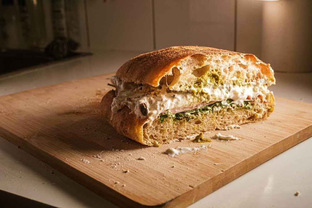 J’ai préparé un sandwich pour l’occasion à base de pesto, mortadelle, burrata, roquette et pistaches concassées (bien sûr un peu d’huile d’olive).