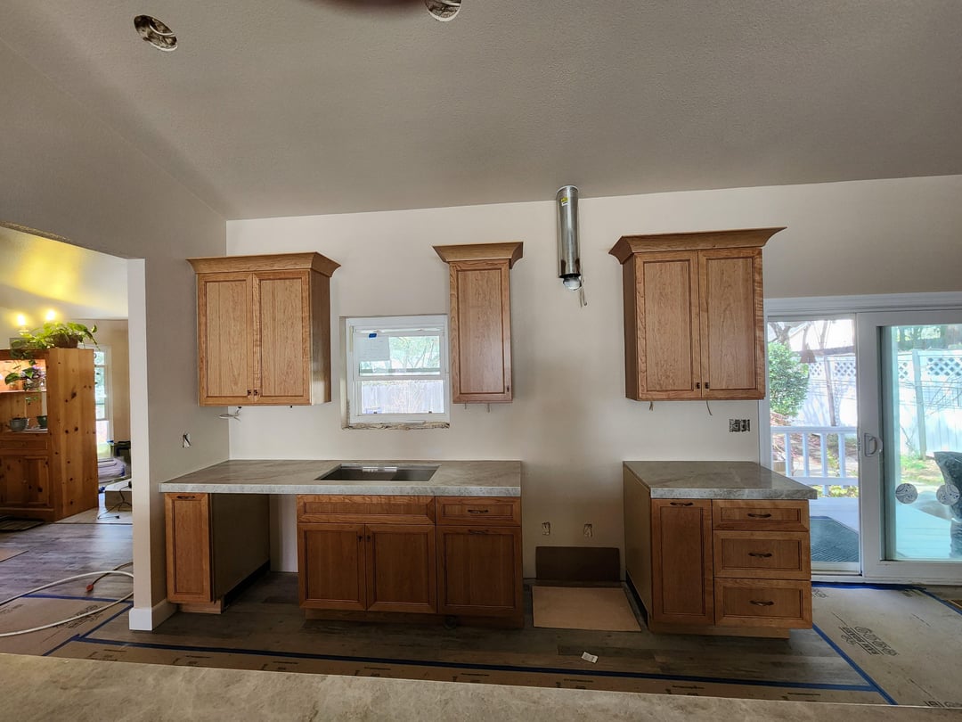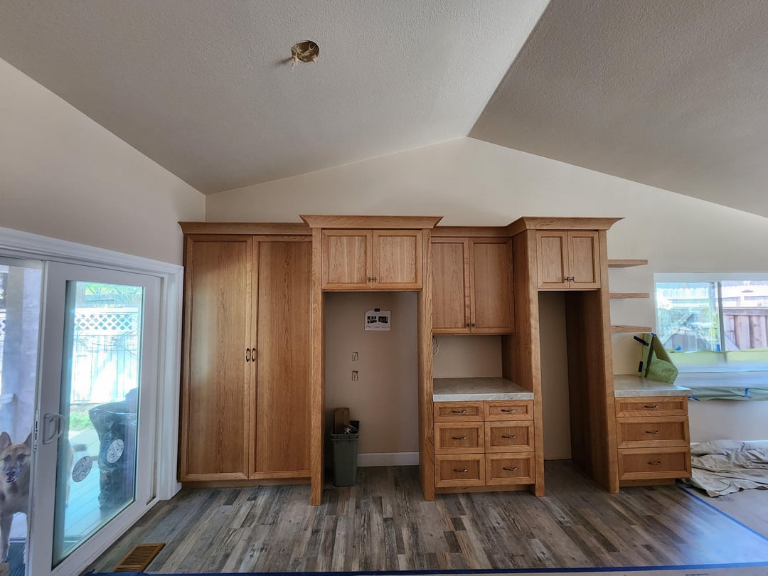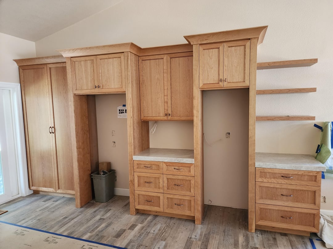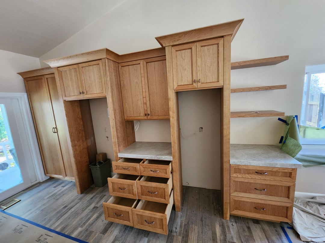 Shaker style in Cherry. So very classic. Beautiful job OP. Would love to see photos of this kitchen fully completed with all fixtures and appliances installed. If you get a chance to see take photos of it at that point, please post.