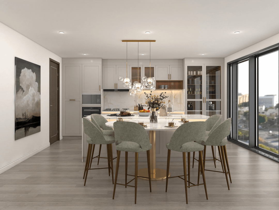 I hate the intersection of the table with the island. Either make it abut the island with a half round or just have them separate enough to walk around.