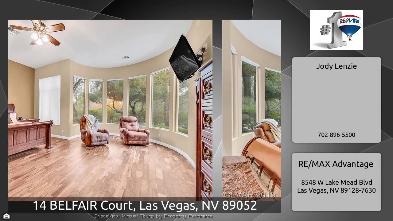 The Virtual Tour for the property at 14 BELFAIR Court, Las Vegas, NV 89052 listed for $1,199,000: Other homes for sale by Jody Lenzie of RE/MAX Advantage: Many custom upgrades in this 1 story home in a guard gated community!Wood flooring thruout*modern inlay glass doors*open living area w/high ceilings and large windows over looking private back yard*bar area w/wine fridge*Bright kitchen w/skylight, granite counter and backsplash,subzero fridge*separate master bedroom w/bay window, french door out to back patio*all beds w/baths*pool and raised spa*covered patio*inlay grass area*oversized garage