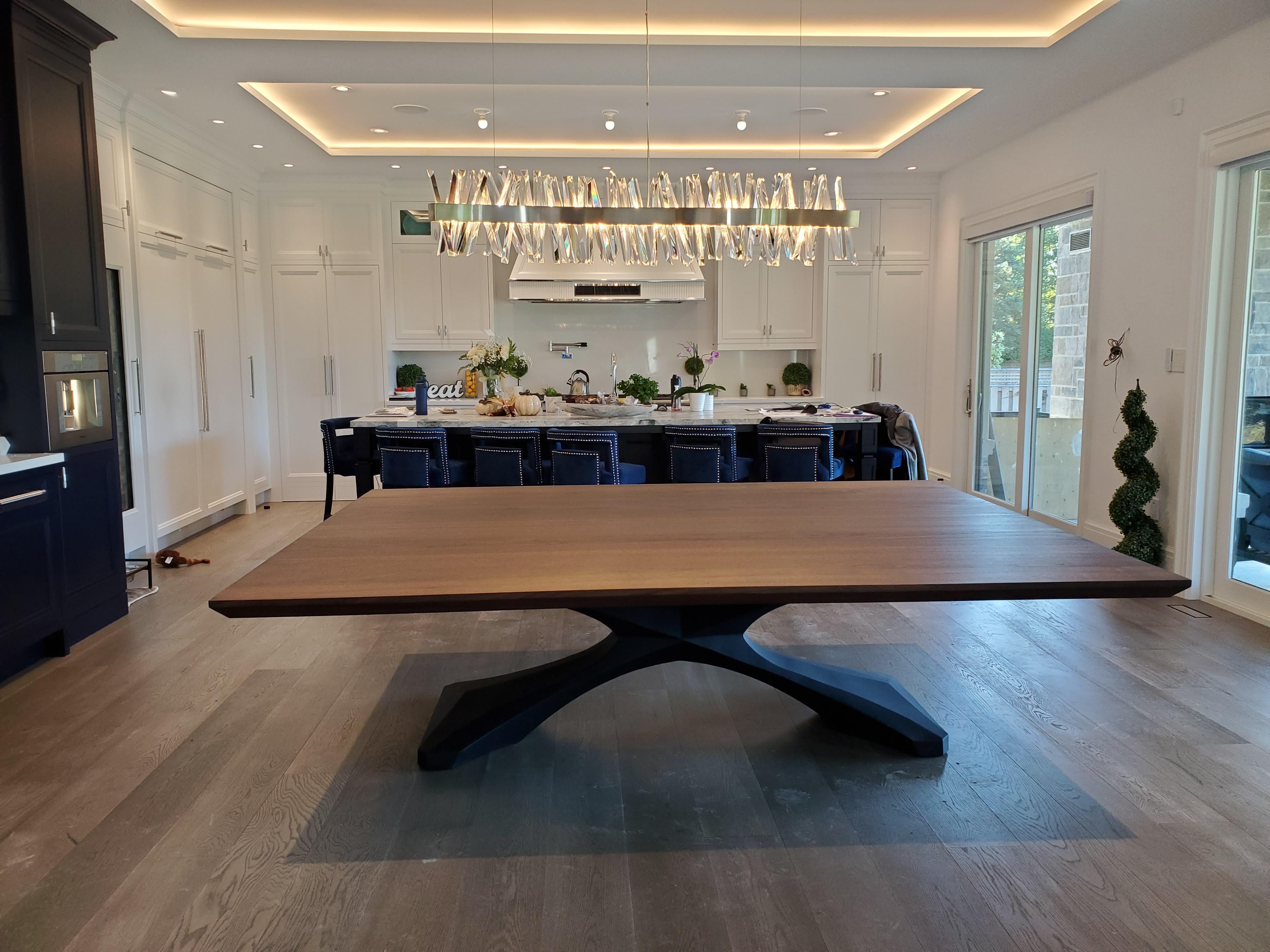 Wow, that table is stunning! I’d pair it with a modern rustic chandelier, something less busy.