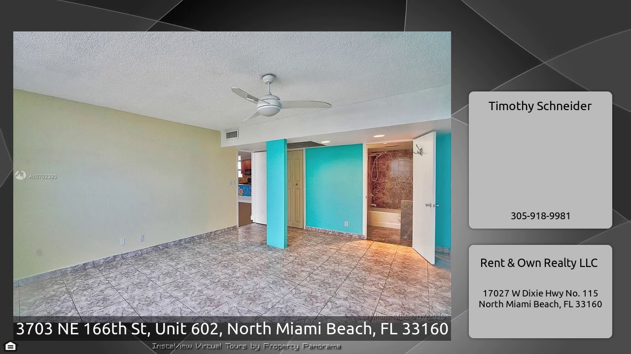 The Virtual Tour for the property at 3703 NE 166th St, Unit 602, North Miami Beach, FL 33160 listed for $335,000: Other homes for sale by Timothy Schneider of Rent & Own Realty LLC: Extremely rare 2008 sq ft condo in the beautiful gated community of Eastern Shores. Kitchen opens to expansive living and dining area, leading to two balconies with tremendous views of the intracoastal and Eastern Shores canals. Eat in kitchen has granite counters with room for additional cabinetry and appliances. Two master bedroom suites with large walk-in closets. Third bedroom with french doors would make a …