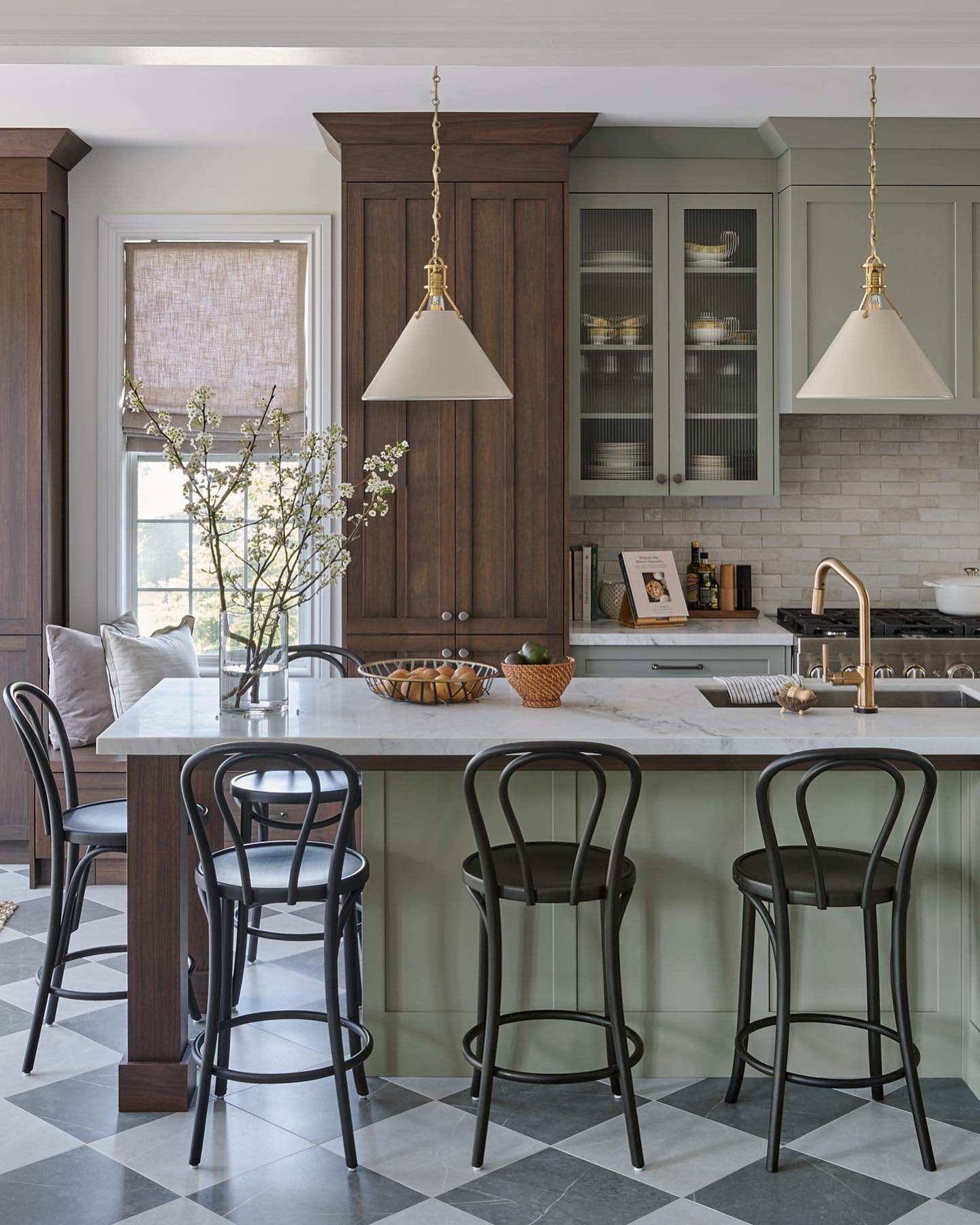This kitchen is everywhere right now! It’s so of the moment: warmer, mix of traditional (checkered floor, cafe chairs), and modern (clean detailing: crown, fixtures).
