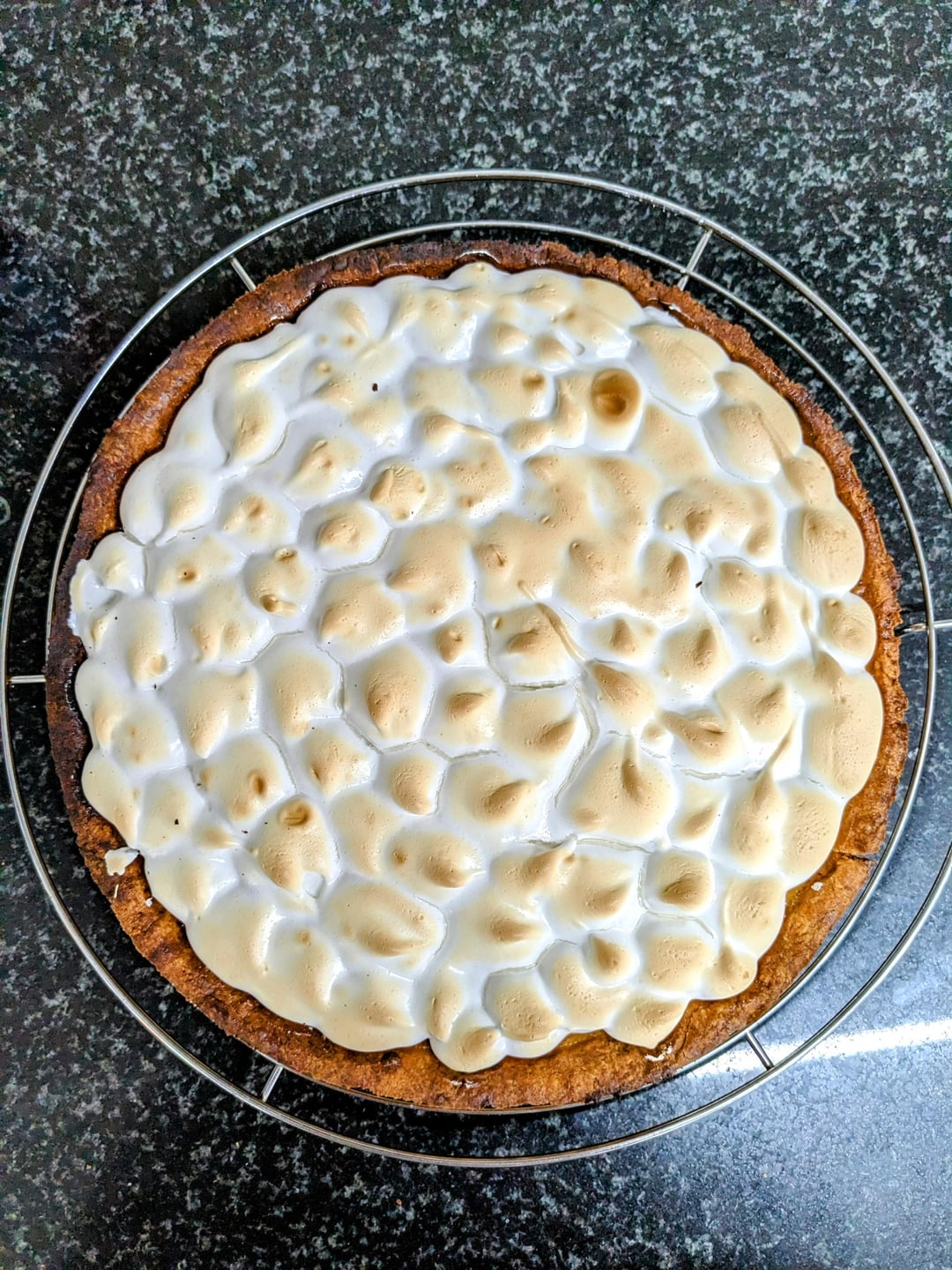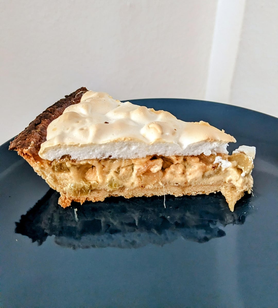 Premier essai de tarte meringuée sans robot ni chalumeau. J’ai eu beaucoup de mal à monter ma meringue en bec d’oiseaux. J’ai utilisé une technique où on met directement le sucre dans les œufs et fait chauffer le mélange entre 50 et 60C avant de finir de monter. Soit je n’ai pas laissé chauffer assez (j’ai enlever du bain marie à 50C),soit mon ratio sucre blanc était un peu off (j’ai enlevé un peu de sucre par rapport à la recette suivie car j’avais de petits œufs), doit mon pied mixeur équipé d’un fouet est trop asthmatique.