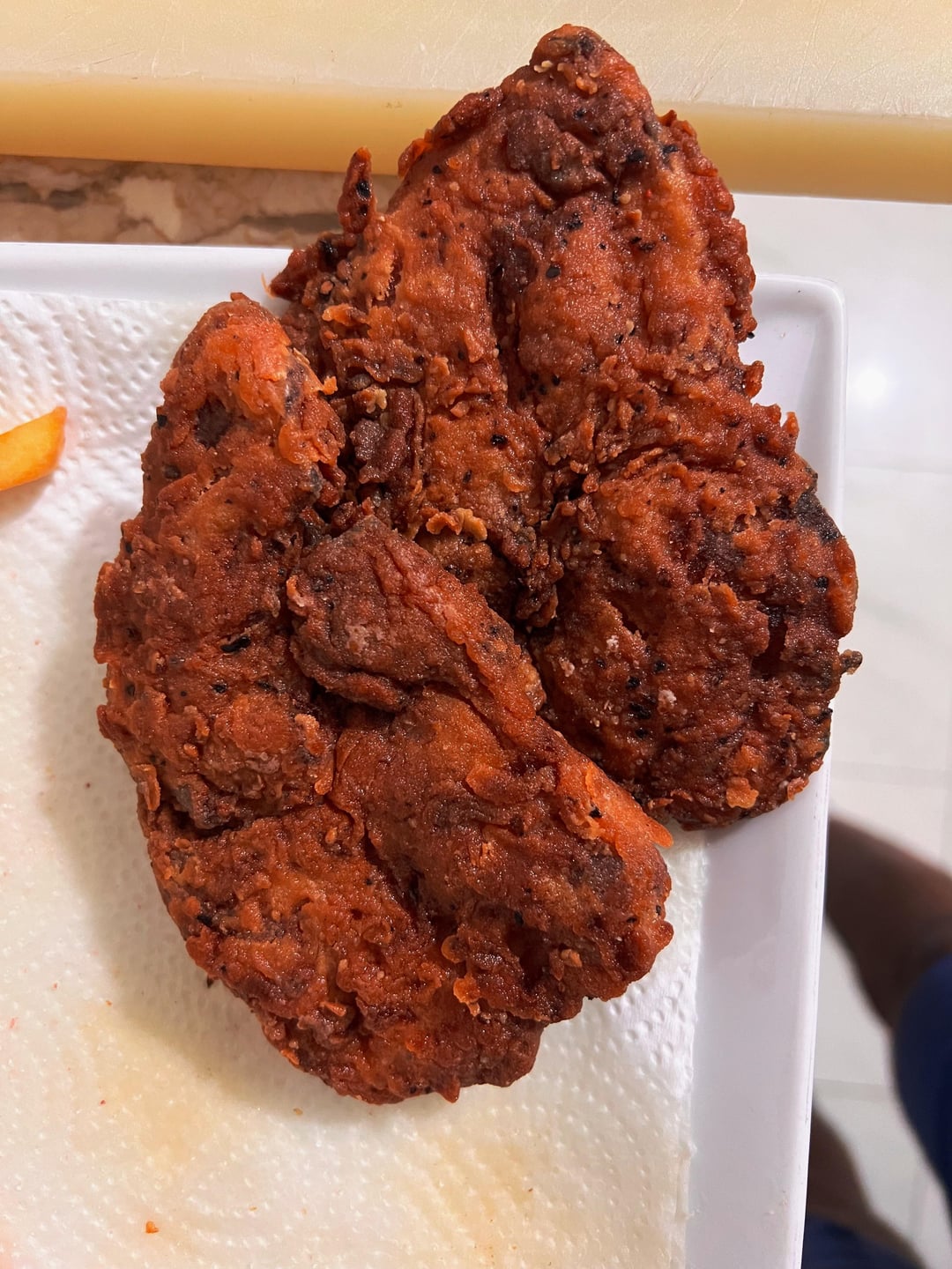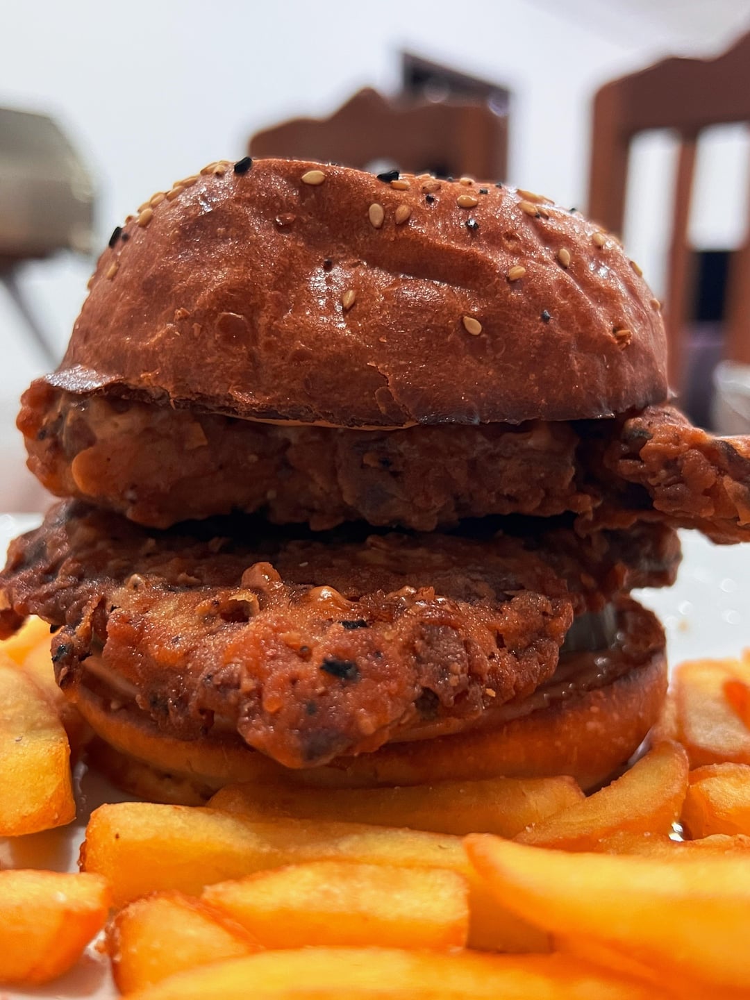 [fait-maison] Burger poulet. Cuisses de poulet désossées et cuites sousvide. Panure composée de farine fermentante et fécule de maïs avec poivre noir et gochugaru( piment coréen). Pickles maison. Buns brioche maison.