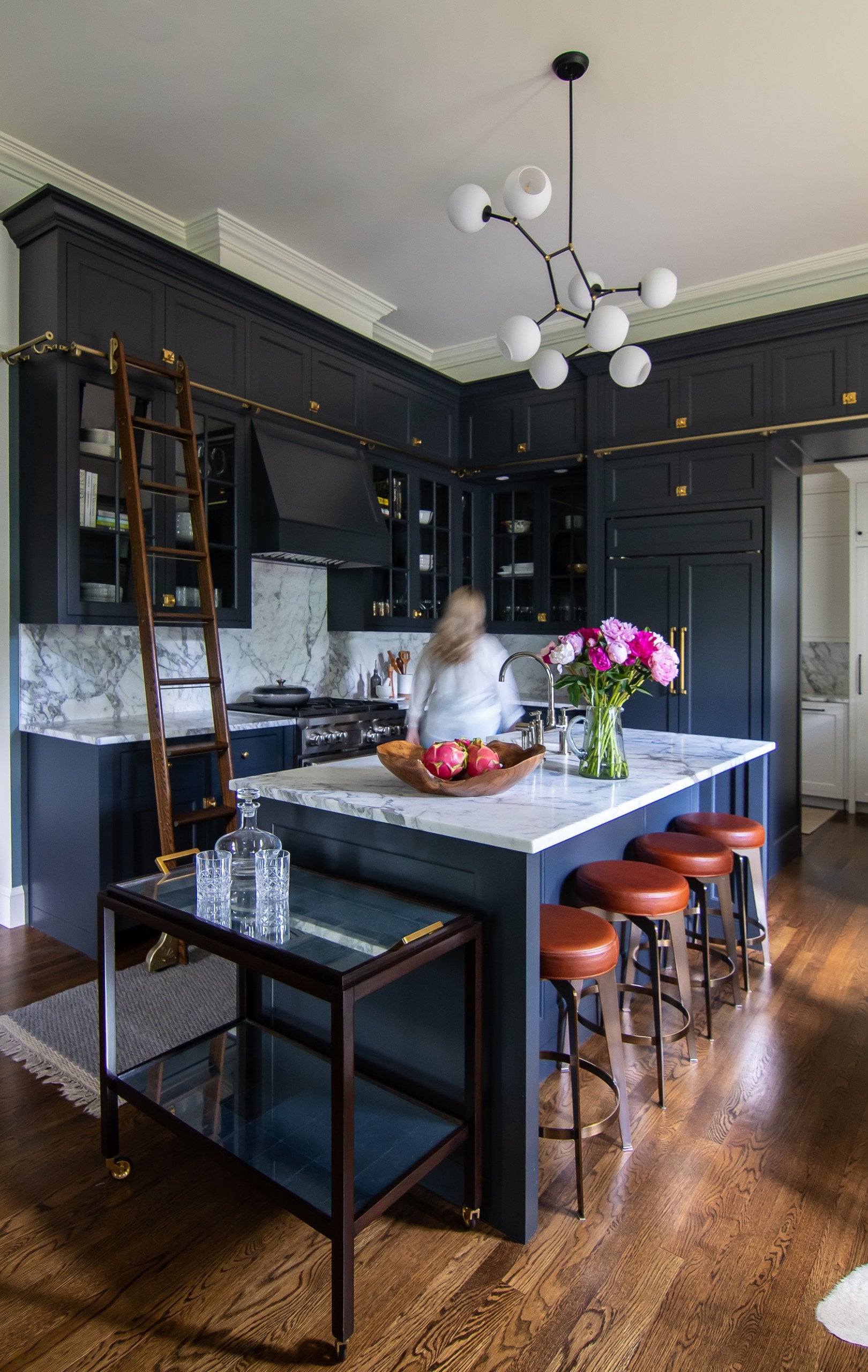 Navy blue custom cabinets with brass pulls and light counters is definitely one of my favorite combinations. The attached ladder that’s always in the way? … less so
