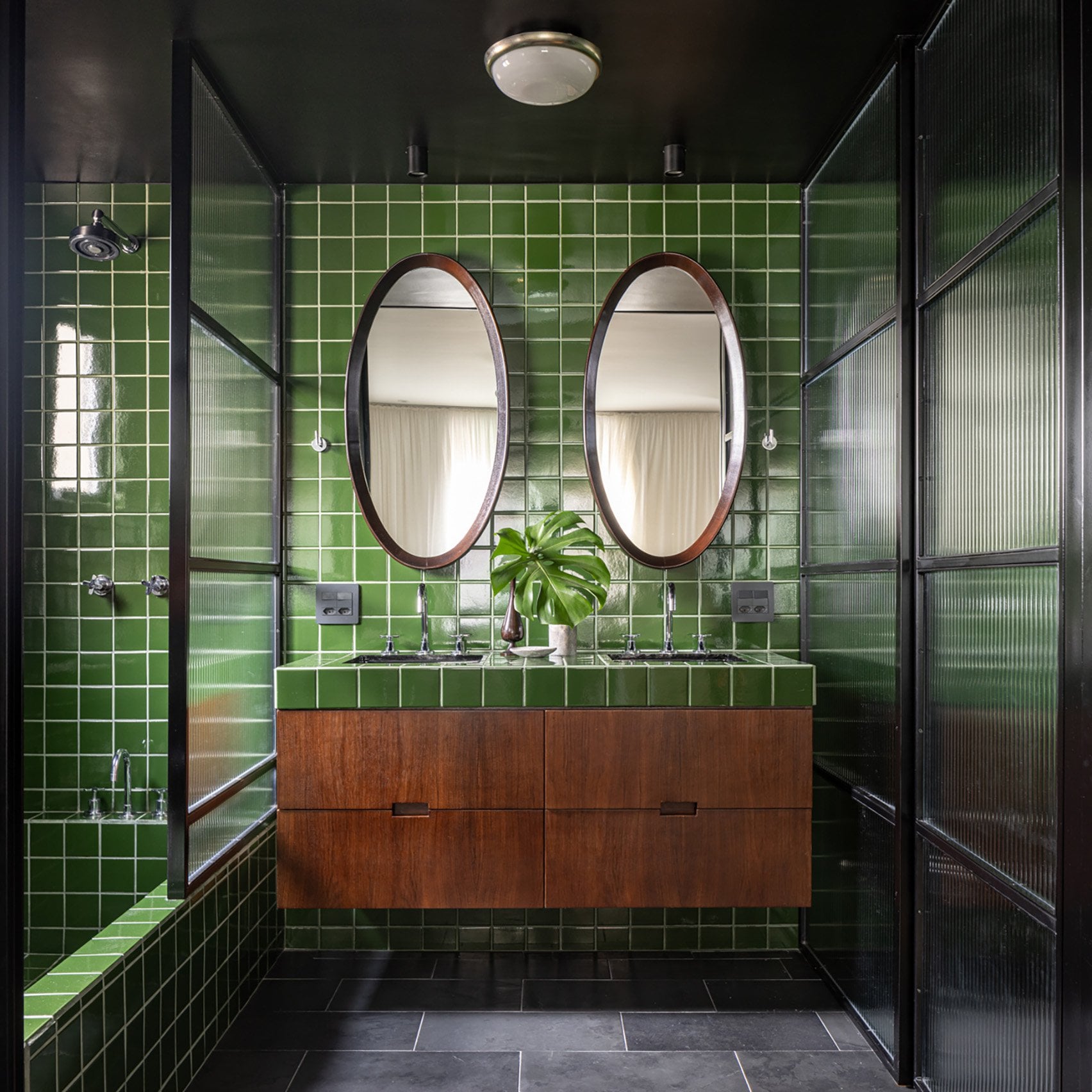 Ensuite bathroom clad with green tiles in a renovated São Paulo apartment, Brazil [1704×1704]