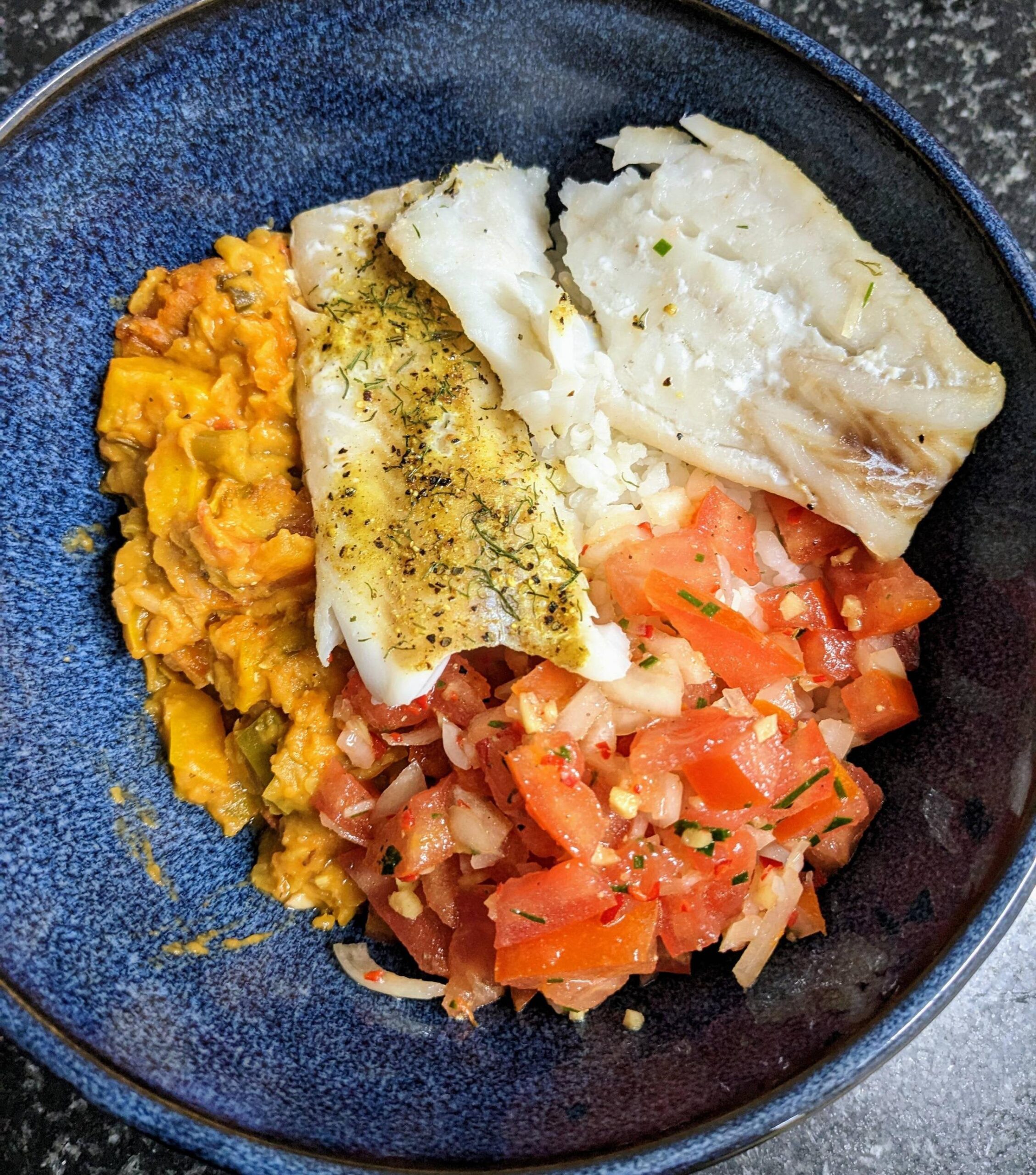 Dahl de lentilles corail au lait de coco, filet de lieu d’atlantique et rougail tomates-combava