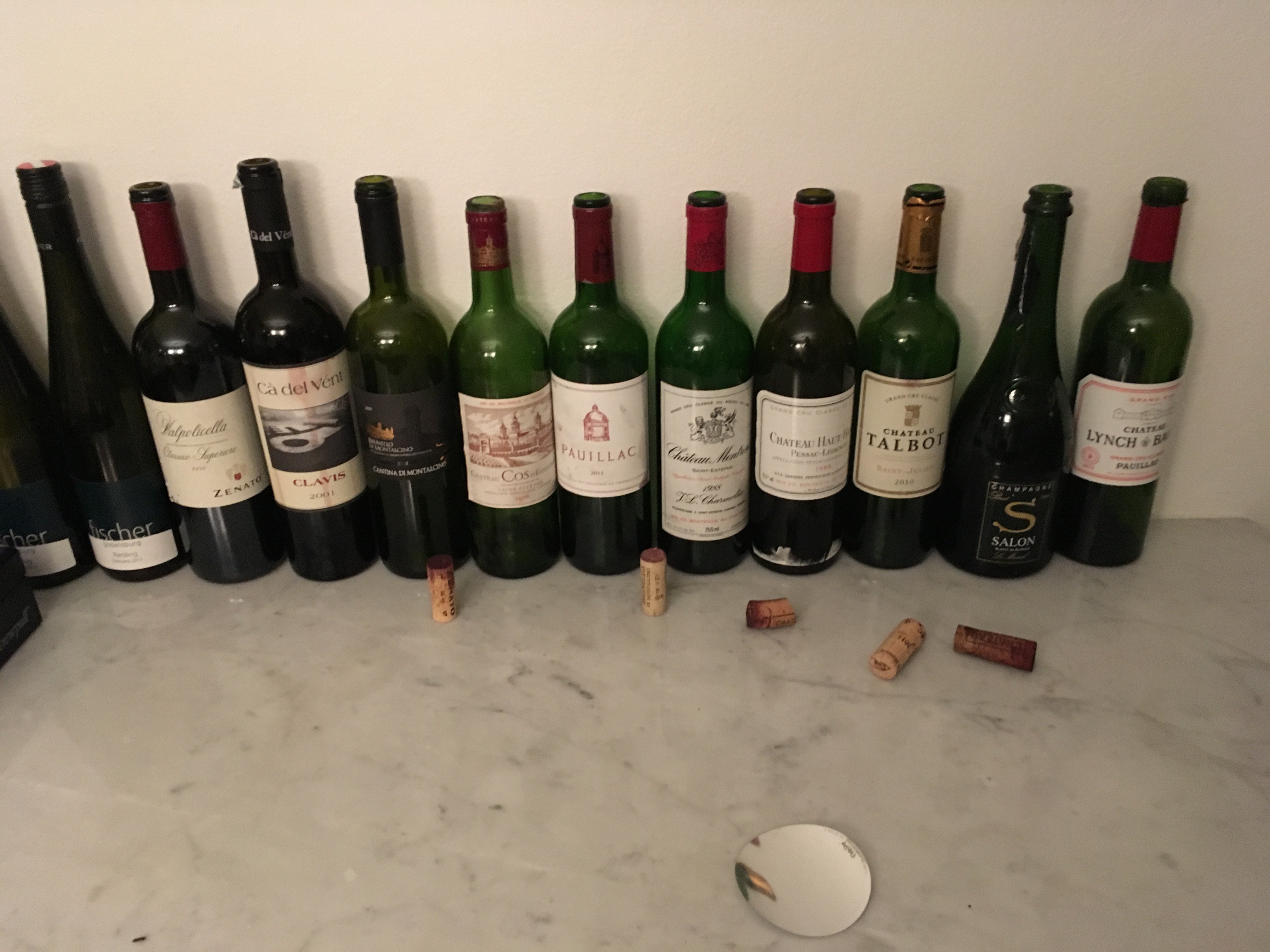 svalli 9 years ago Chateau Talbot Saint-Julien 2010Chateau Latour Pauillac 2011Chateau Montrose Saint-Estephe 1988Chateau Haut-Brion 1988Chateau Lynch Bages Paulliac 2011Chateau Cos d’Estournel 1976Salon Cuvee „S“ Le Mesnil 19992 Bottles of Austrian RieslingValpolicella ZenatoBrunello Di MontalcinoCà del Vént 2001never in my life have i had so many nice bottles in one night, plus the Salon was freaking awesome. 10/10 will never forget.