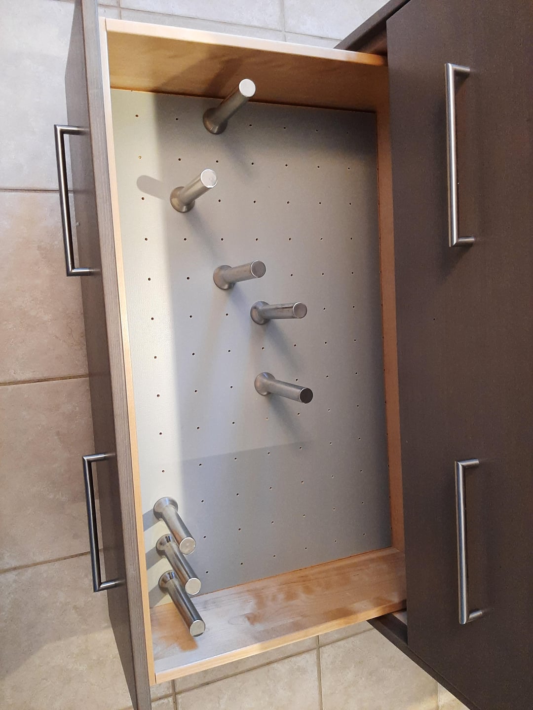 It’s called a drawer peg board. It’s to safely pile up, say, dishes and bowls and keep them in their place as you open and close the drawer. Google it for some visual explanation