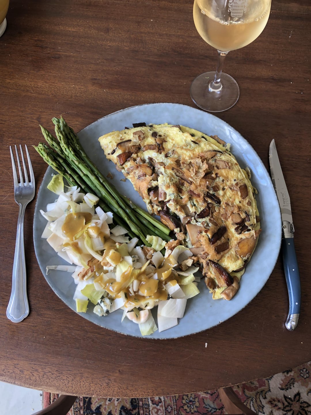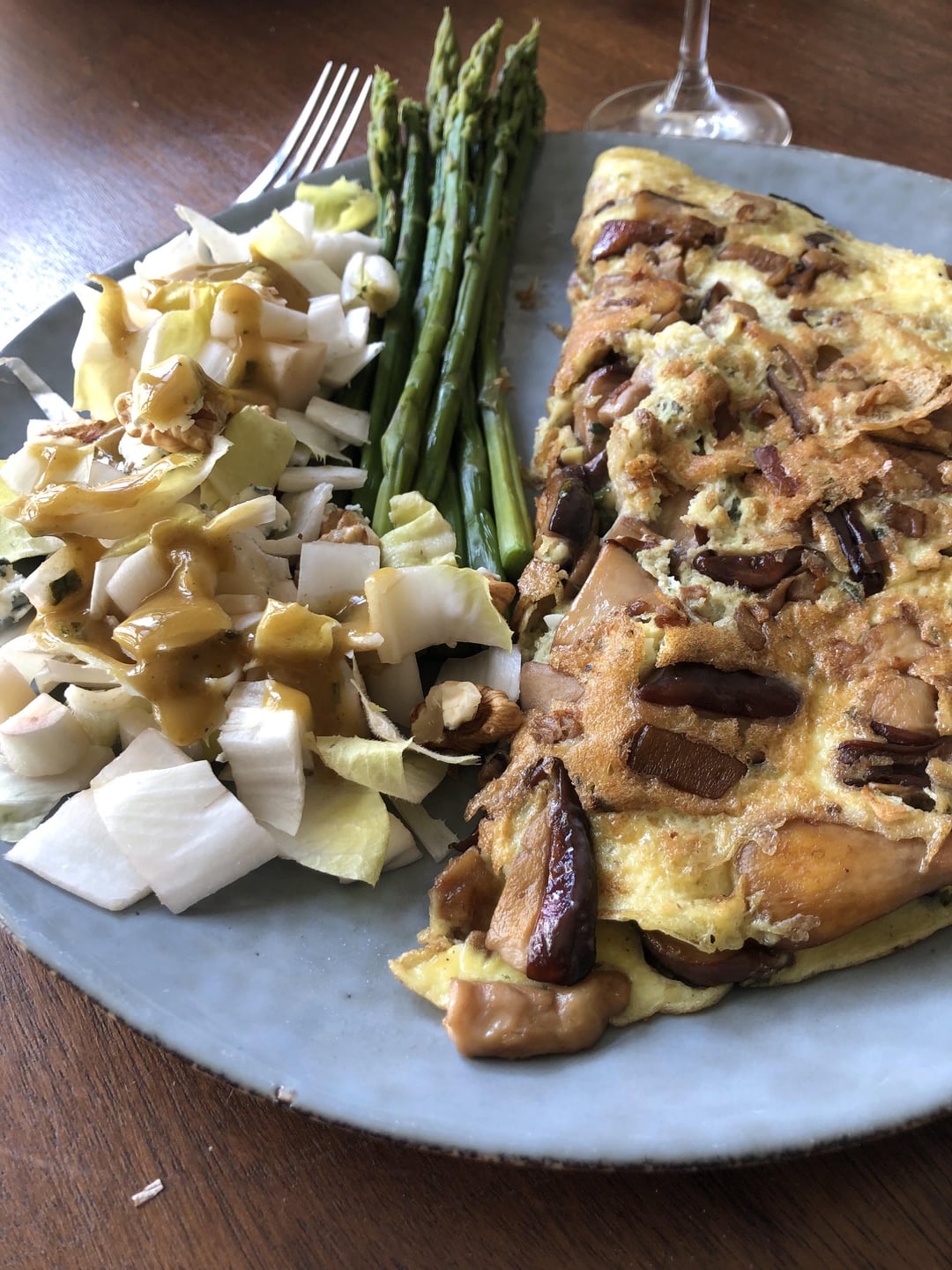 Elle a une bonne tête cette omelette. J’en ai marre que mes omelettes à moi finissent presque toujours en oeufs brouillés parce que je n’arrive pas à maîtriser l’omelette sur poêle en inox sans revêtement anti-adhésif et sur induction