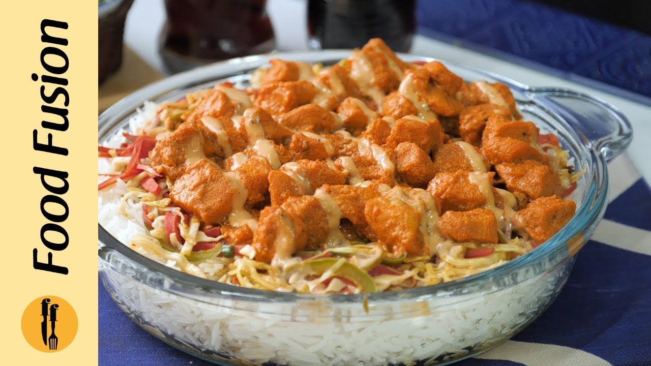 -Serving dish mein boiled chawal,lal mirch+lehsan ka tadka,cooked vegetables,cooked tandoori chicken aur tayyar sauce drizzle ker ka serve karein.