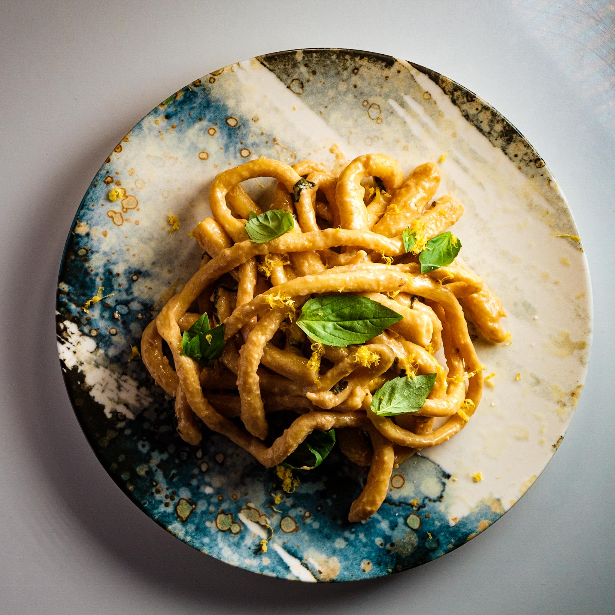 14. Ajoutez le zeste et le jus de citron, les pici, le parmesan et le basilic ciselé