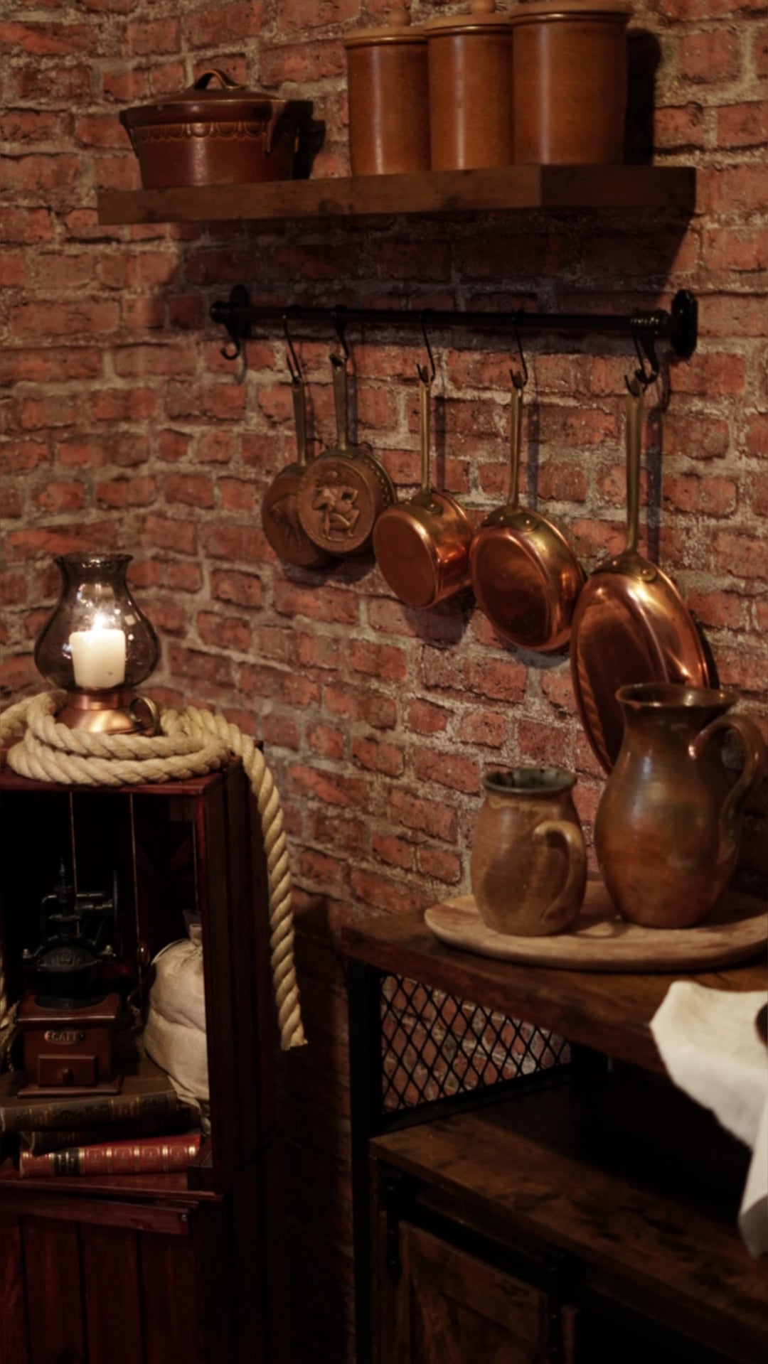 If that’s a kitchen, I’m afraid I can’t see it. Nice brick and copper pots though!