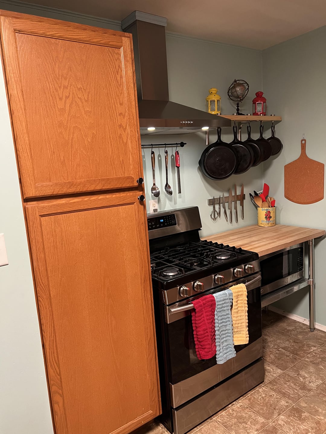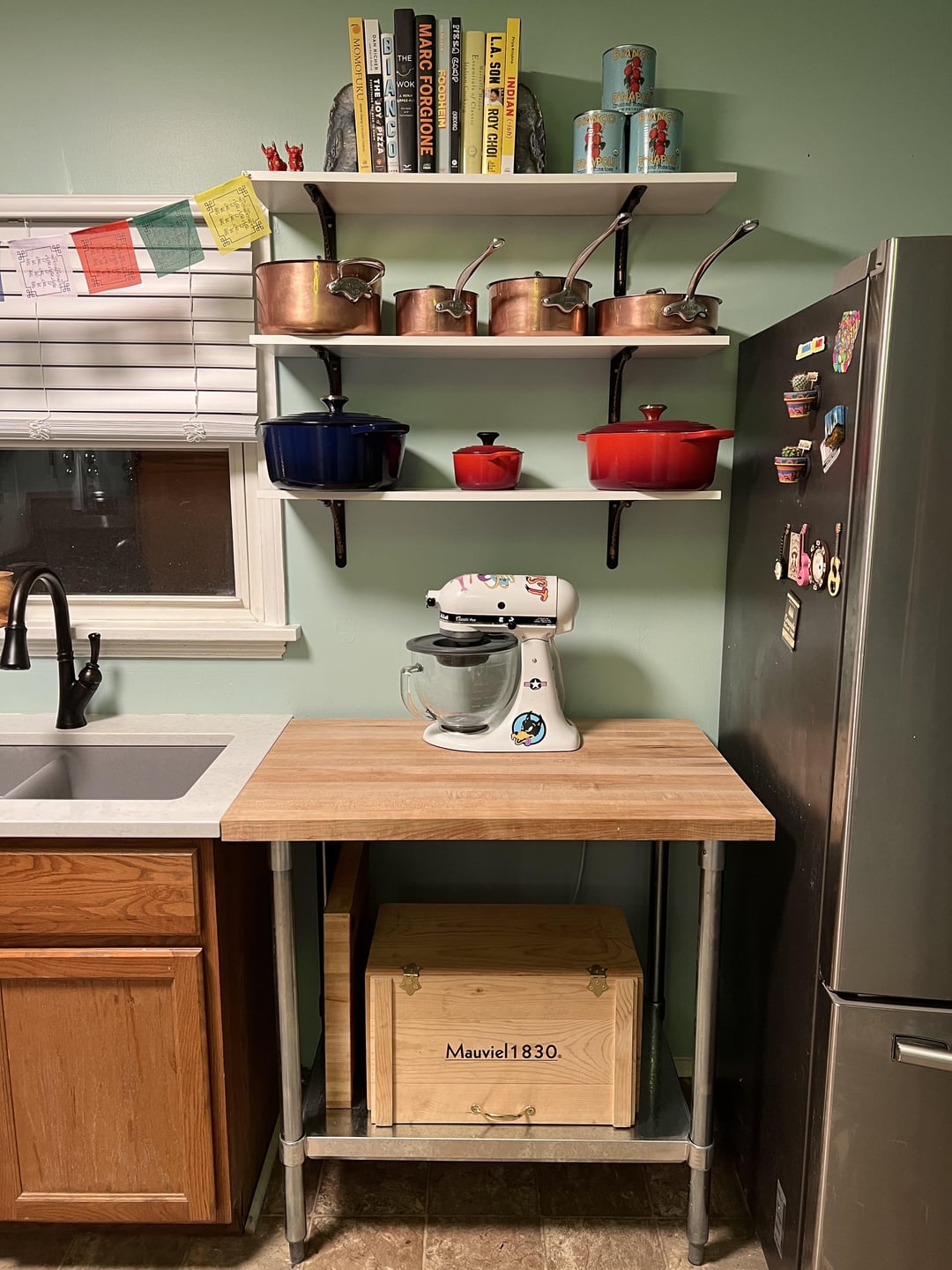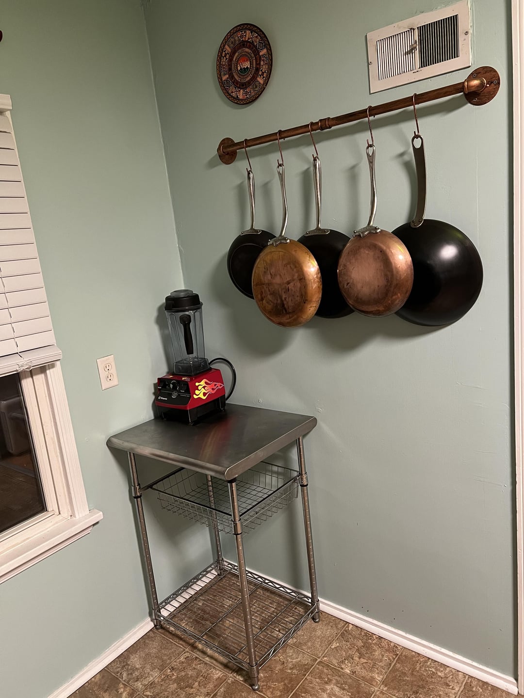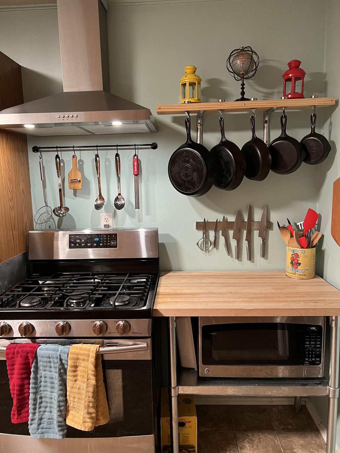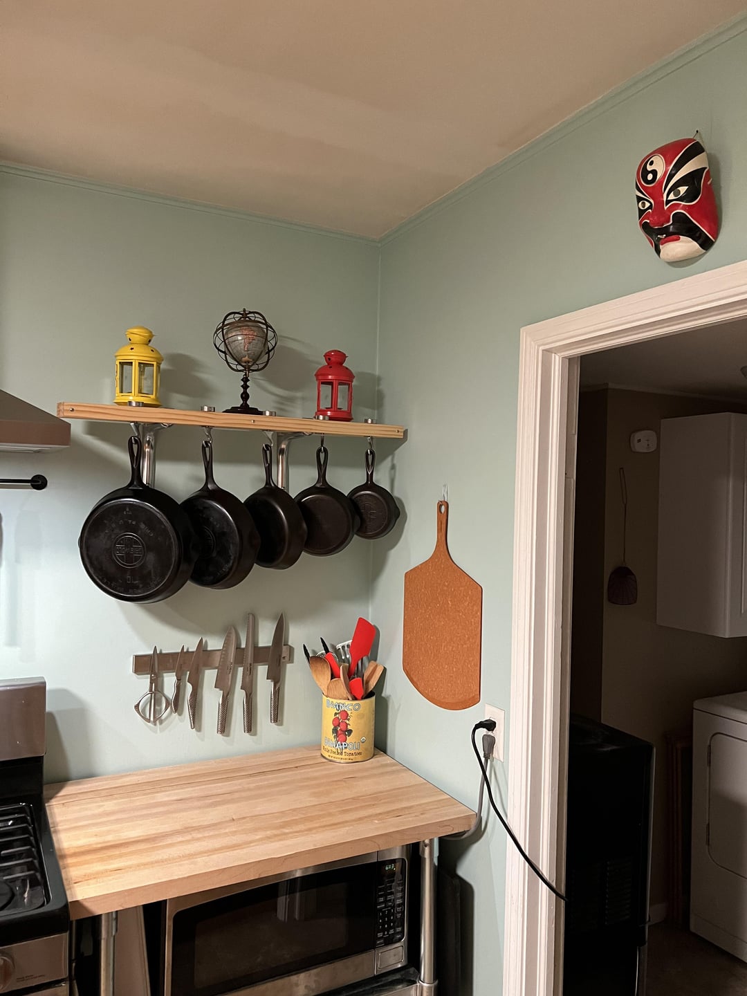 Props to the shelf which is holding up those cast iron pans. Surely that’s a decent amount of weight hanging there.