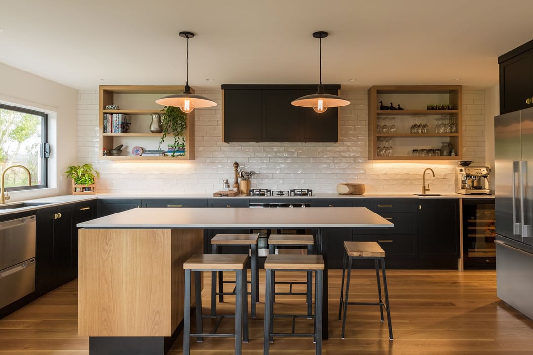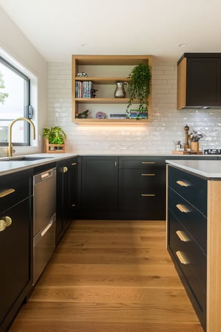 I love the lower cabinets and all the counter space, but open shelving and no vent hood means those glasses are going to have a permanent coating of grease.
