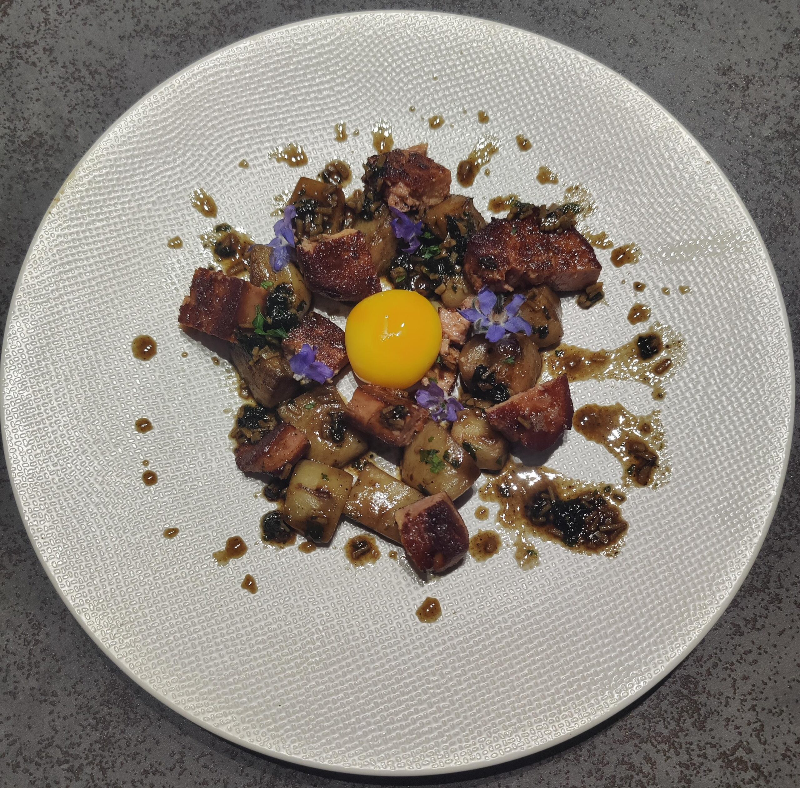 Cèpes et foie gras poêlés, jaune d’œuf et jus de viande maison