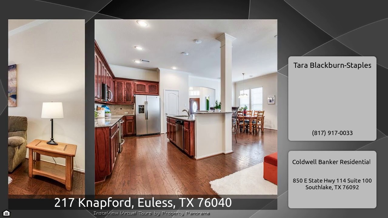 The Virtual Tour for the property at 217 Knapford, Euless, TX 76040 listed for $330,000: Other homes for sale by Tara Blackburn-Staples of Coldwell Banker Residential: Impeccable 3-2.5-2 + study, well maintained & shows exceptionally well. The open plan creates great space for entertaining. The beautiful kitchen features an oversized island, an abundance of granite counter space & cabinets, double walk-in pantry, backsplash, stainless appliances, & overlooks both the dining & family rms. The private study has French doors & built-in bookshelves. Relaxation is easy in the spacious master …