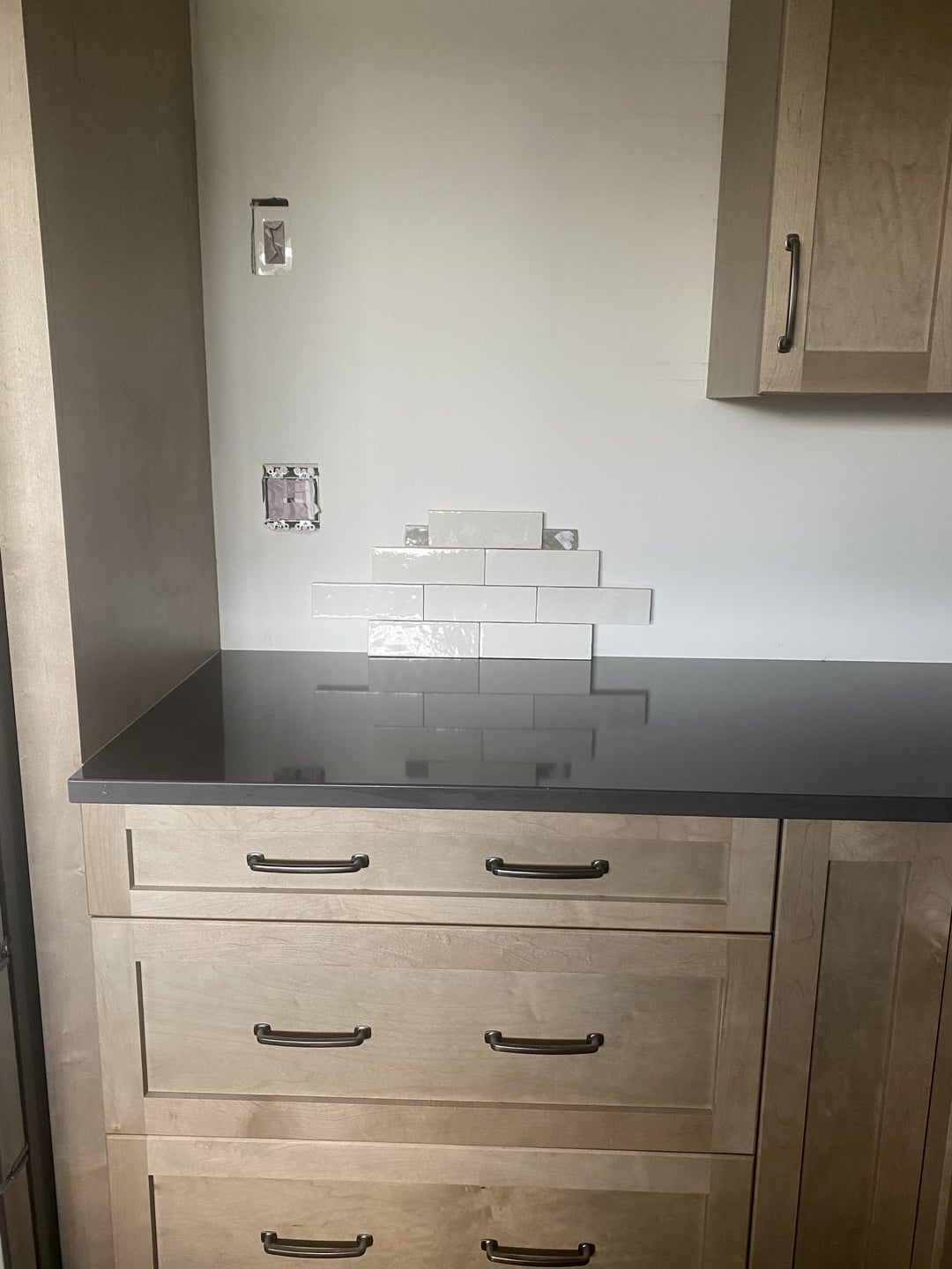 We are remodeling our kitchen as we speak. Took us over a month just to pick a backsplash to tie in our cabinets, floor and counter tops. So frustrating. We went with a multi color linear tile and it ties all three in. So frustrating. I wanted subway tiles but could not find anything to bring it all together. Looks like you found a soft color to break up the counters and cabinets while blending them together. Enjoy it.
