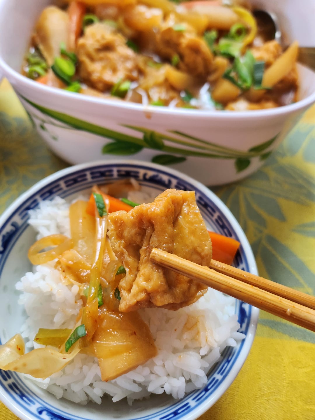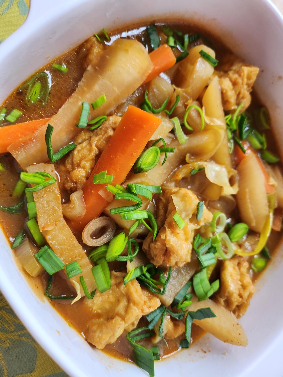 Nouveau ragoût au miso à la coréenne, cette fois avec du tofu frit, et plein de légumes : panais, carottes, poireau, chou, etc.