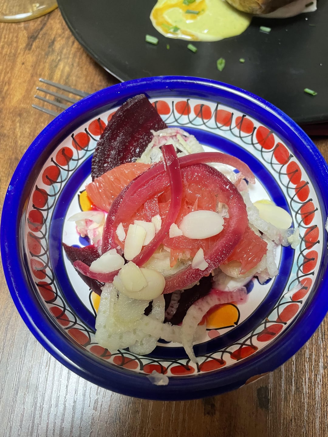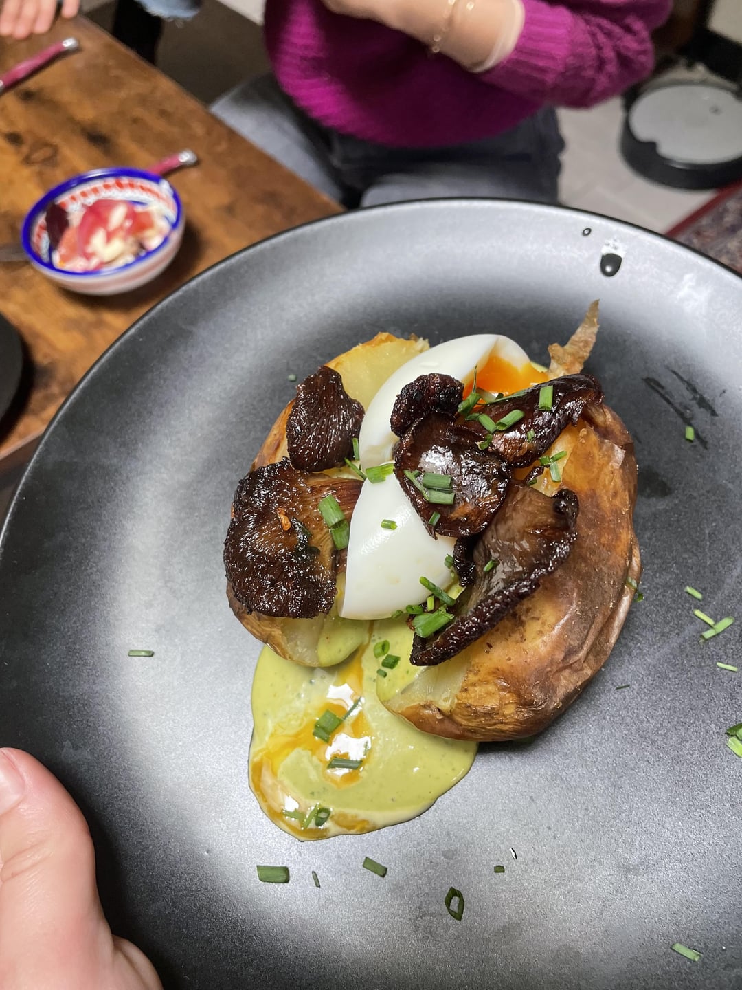 J’ai repris la recette d’Ottolenghi pour la pomme de terre en robe des champs (livre « Simple »), j’ai juste rajouté des petites pleurotes par dessus car passion champignons ici ! La mini salade c’est une recette de Whoogys tirée de son livre, la salade fenouil/betterave/agrumes, on a pas mis d’oranges car on est pas particulièrement fans, c’était hyper bon, très frais avec ce côté acide/amer entre le pamplemousse et les pickles bref… Je vous recommande chaudement ces deux livres !