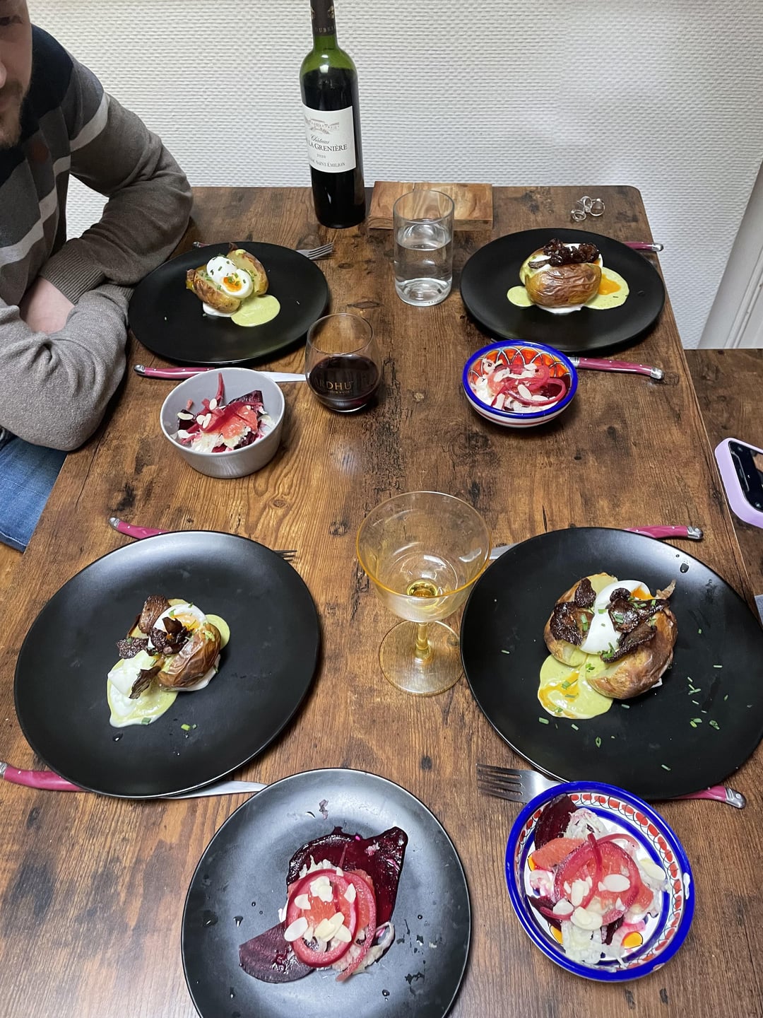 Hier c’était dimanche et le dimanche on fait des drunch avec les copains, et c’était à moi de me mettre aux fourneaux ! J’ai repris la recette d’Ottolenghi pour la pomme de terre en robe des champs (livre « Simple »), j’ai juste rajouté des petites pleurotes par dessus car passion champignons ici ! La mini salade c’est une recette de Whoogys tirée de son livre, la salade fenouil/betterave/agrumes, on a pas mis d’oranges car on est pas particulièrement fans, c’était hyper bon, très frais avec ce côté acide/amer entre le pamplemousse et les pickles bref… Je vous recommande chaudement ces deux livres !