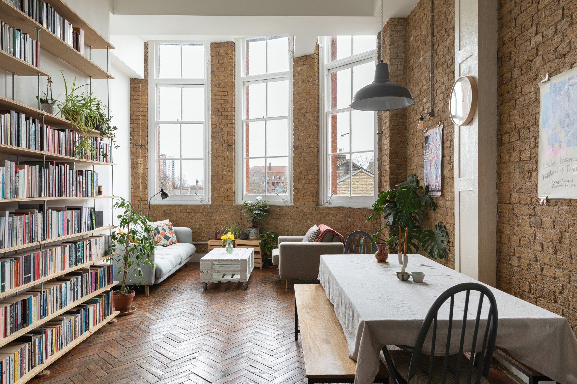 I love the mix of the high ceilings, big tall windows and all the books! That floor looks beautiful with the brick as well!